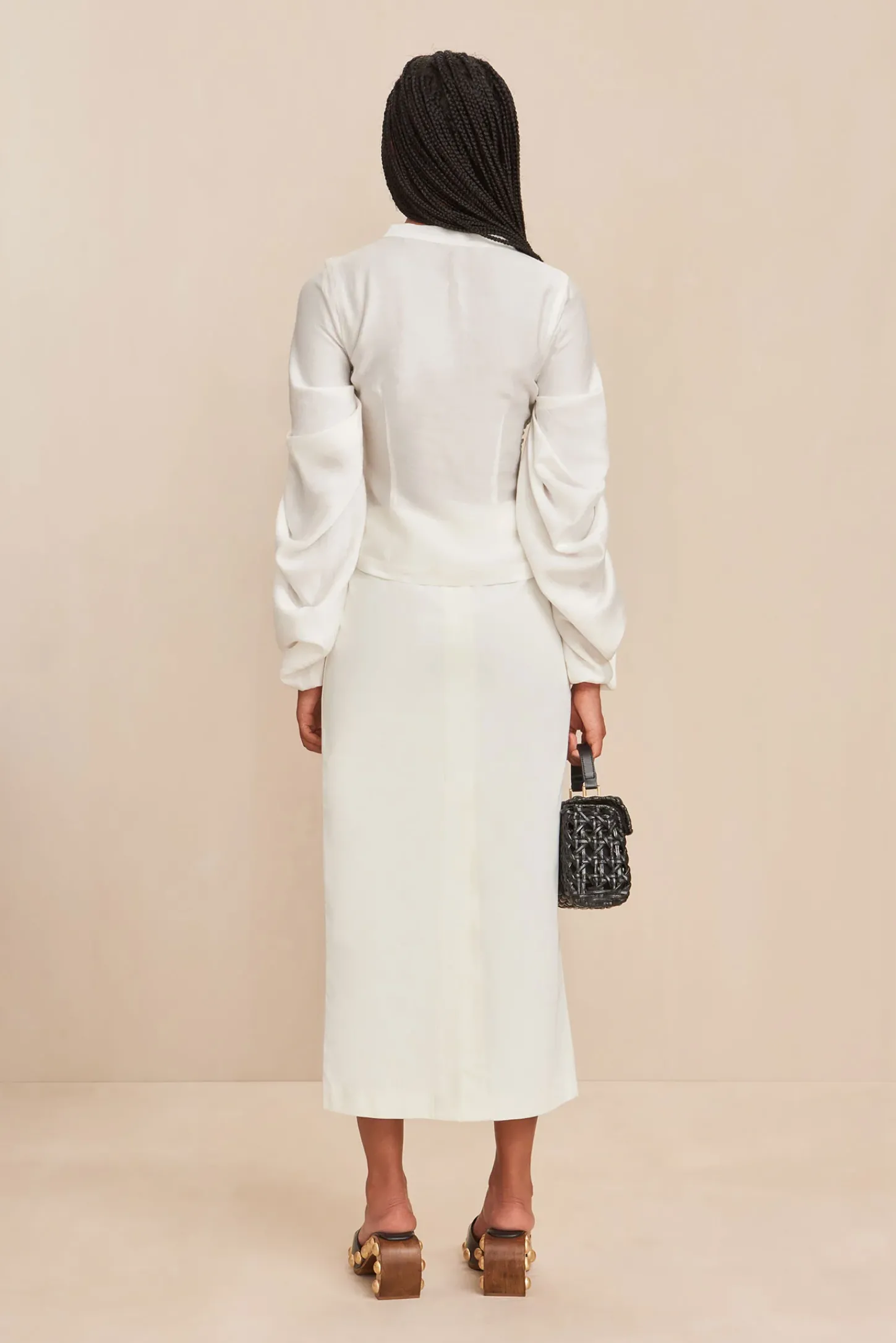 A gathered V-neck top with slightly exaggerated sleeves and ruched details.