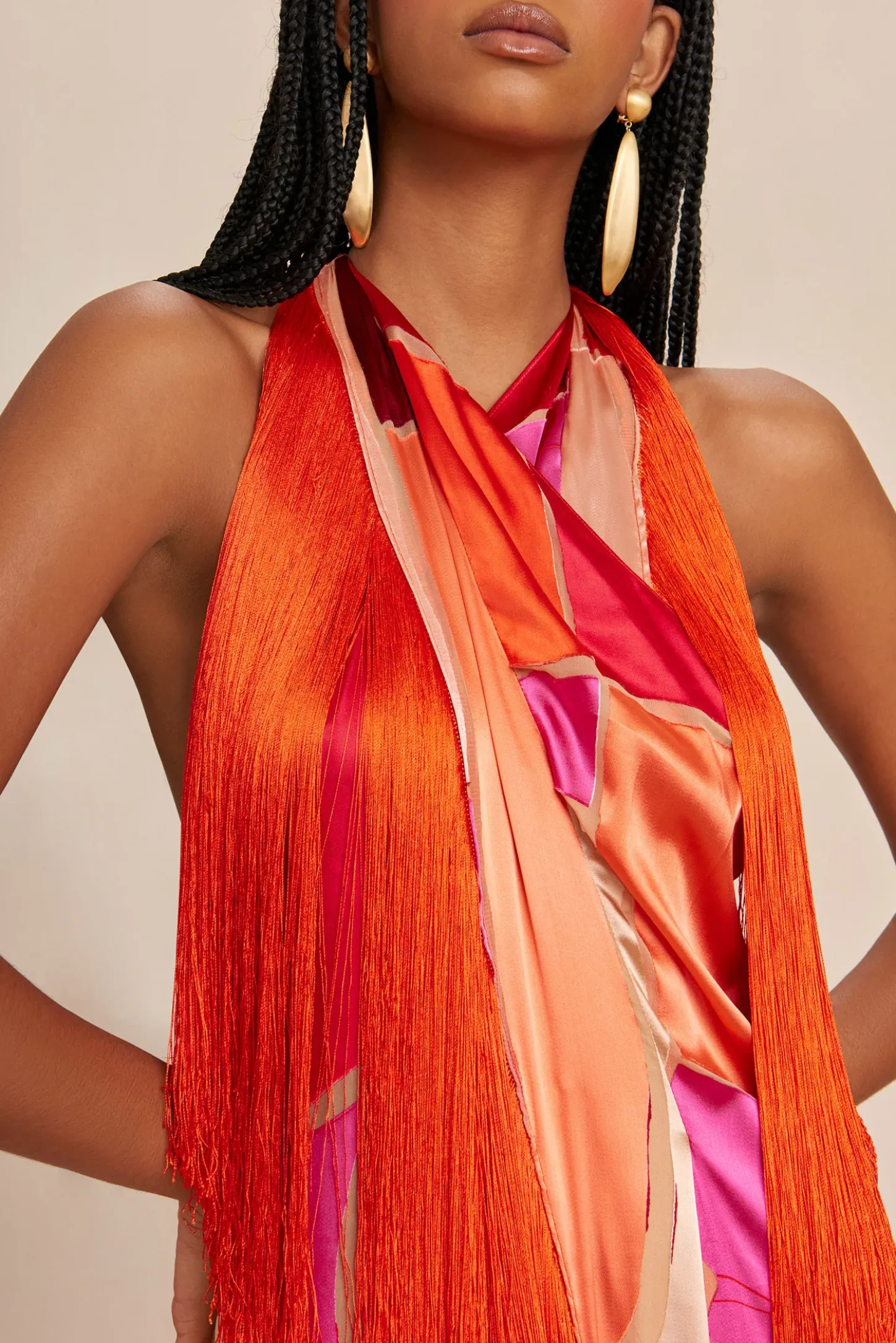An overlapping layered silk dress with long fringe and an open back that ties behind the neck.