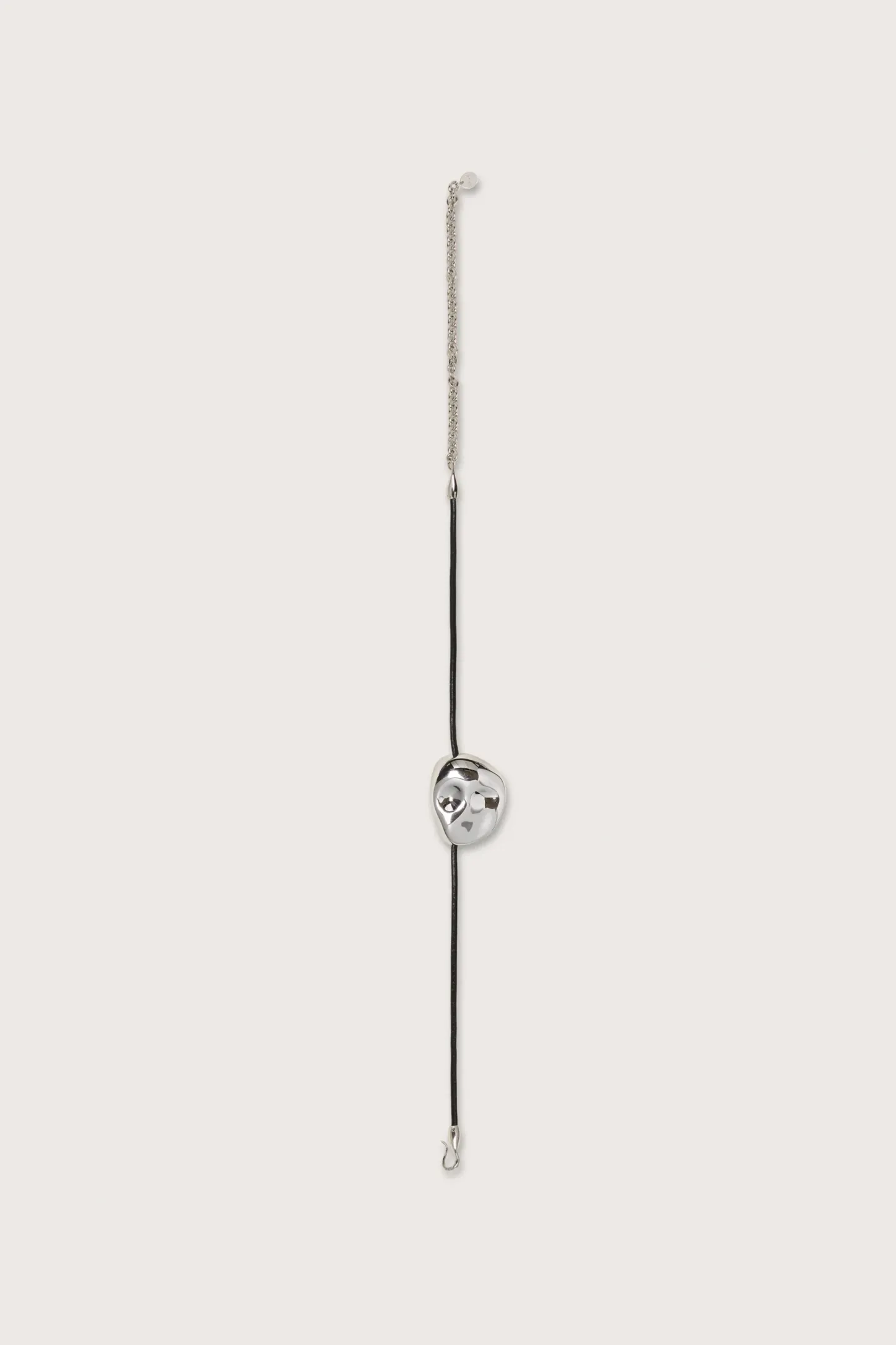 Silver toned molded rock shape sits at the center of this smooth leather cording choker.