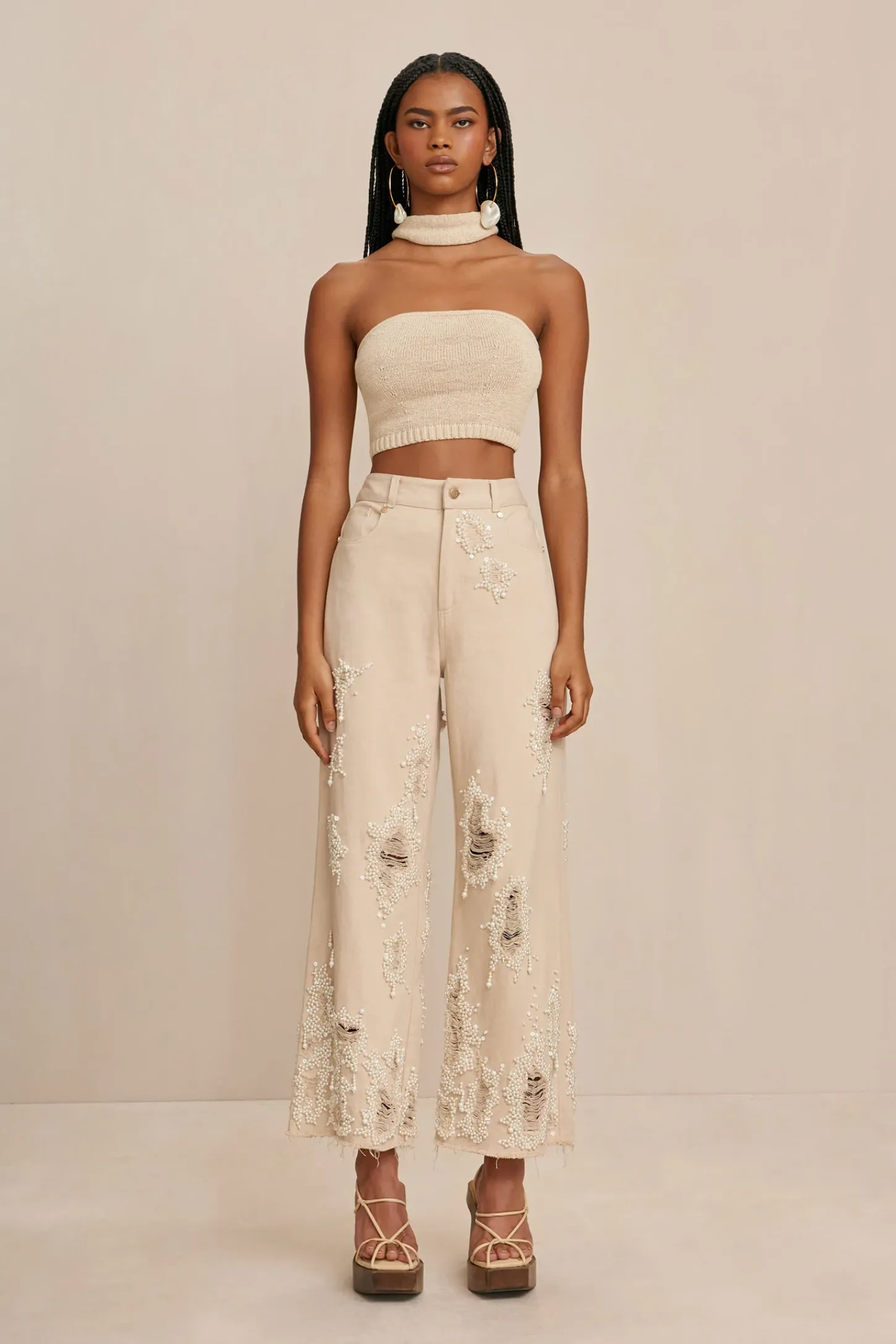 A destressed, high-waisted denim with hand embroidered pearl accents.