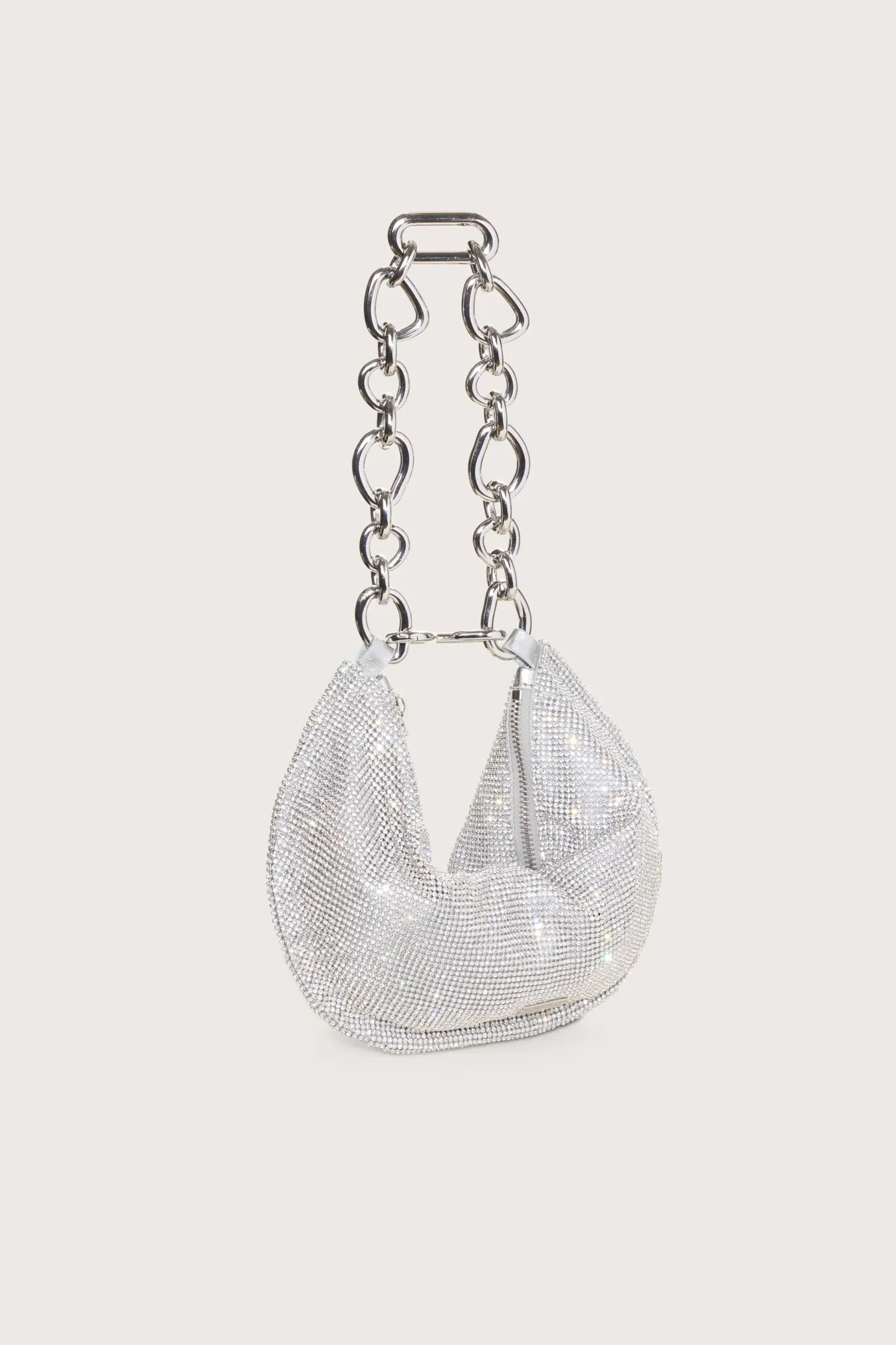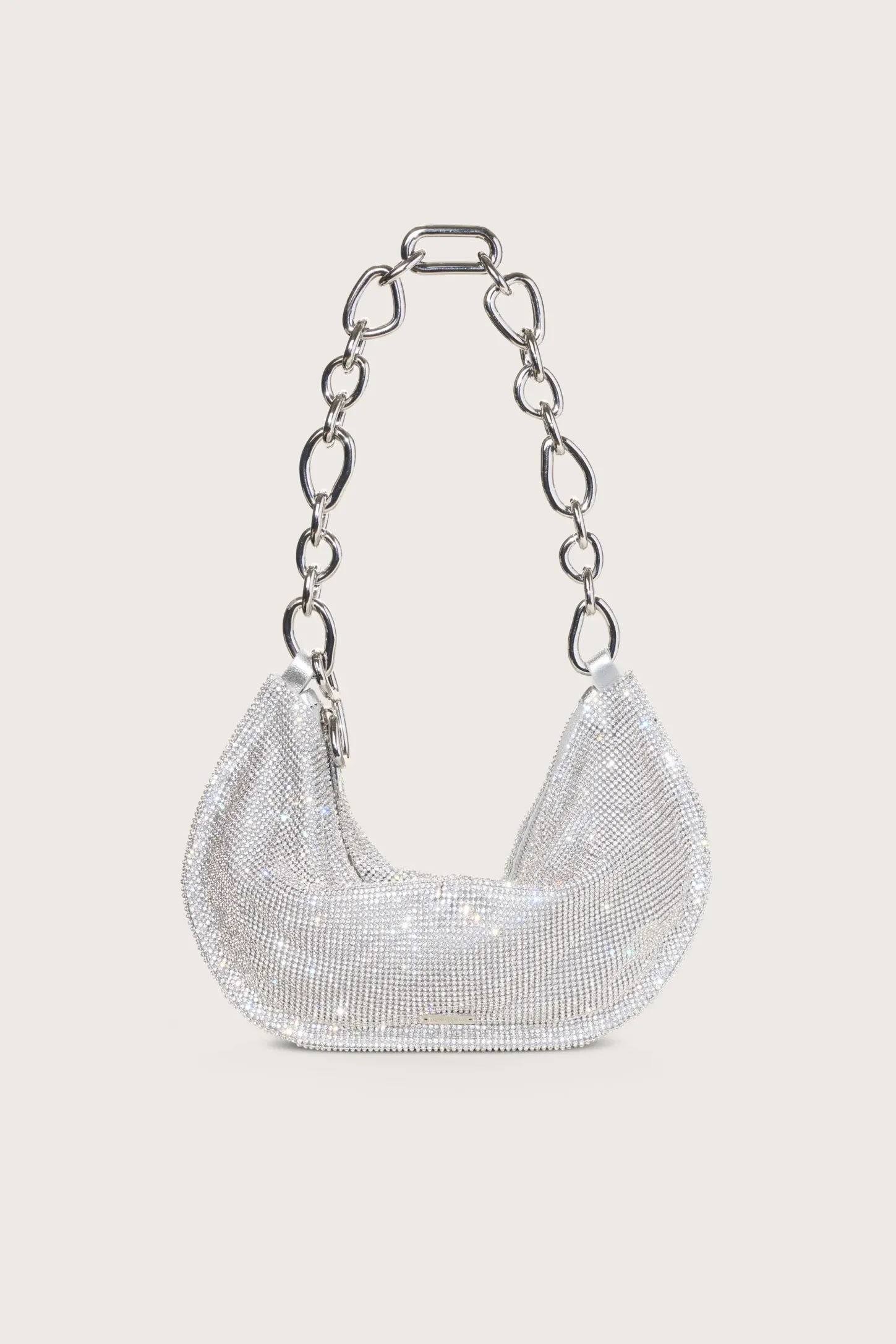 A half moon shaped mini shoulder bag featuring clear rhinestone mesh body and shiny silver-toned chain-link shoulder strap.
