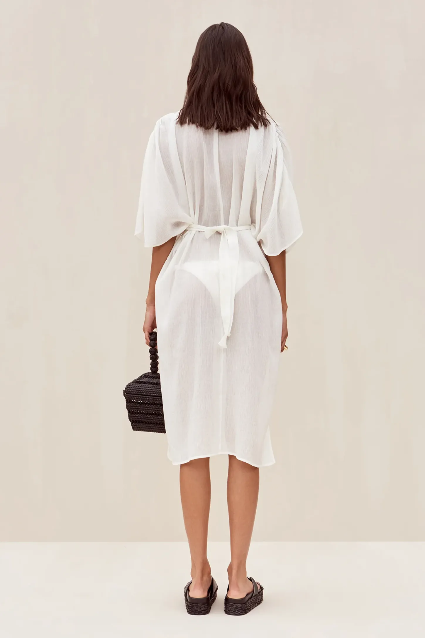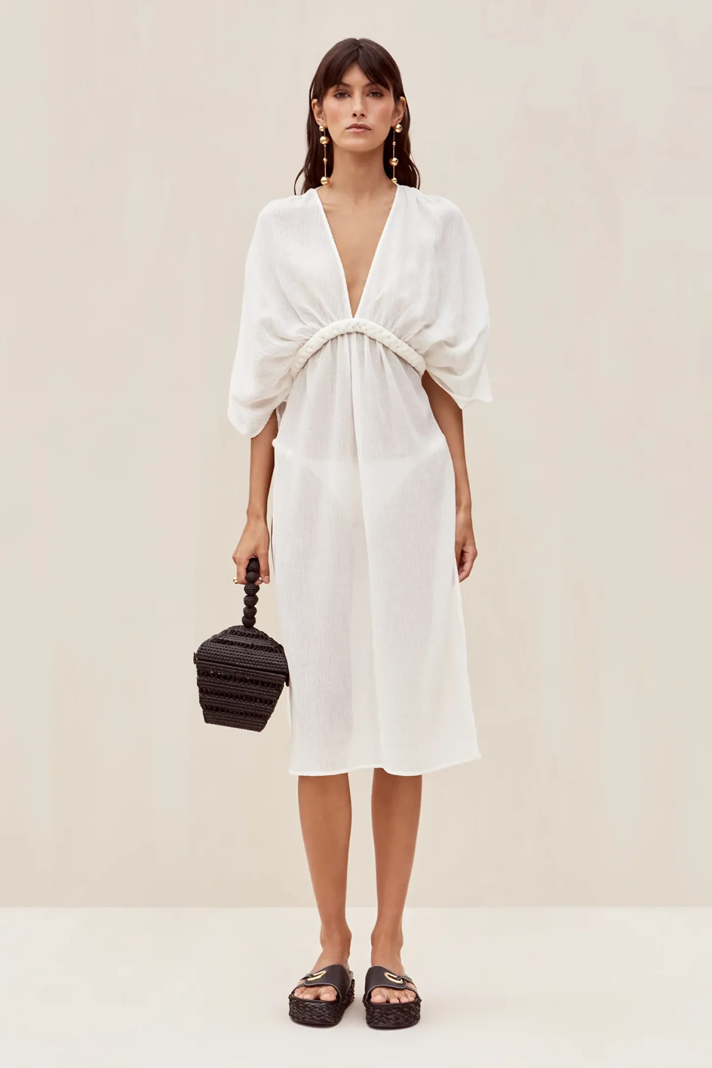 Inga is an ingenious coverup in a silk, linen blend. She has a plunging V-neckline and high side slits. A braided cord wraps from the front and ties in the rear. She exudes goddess vibes and is a must-have for this season.