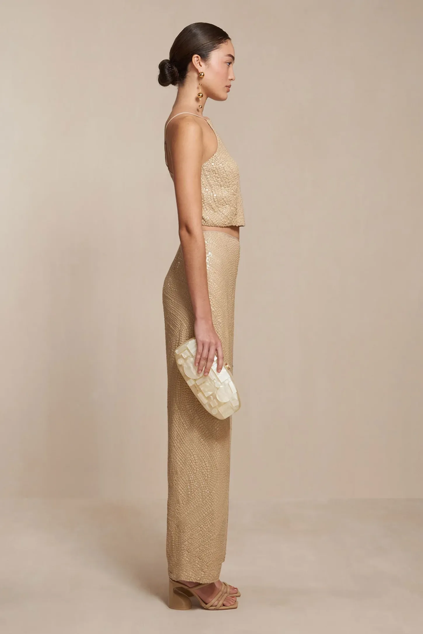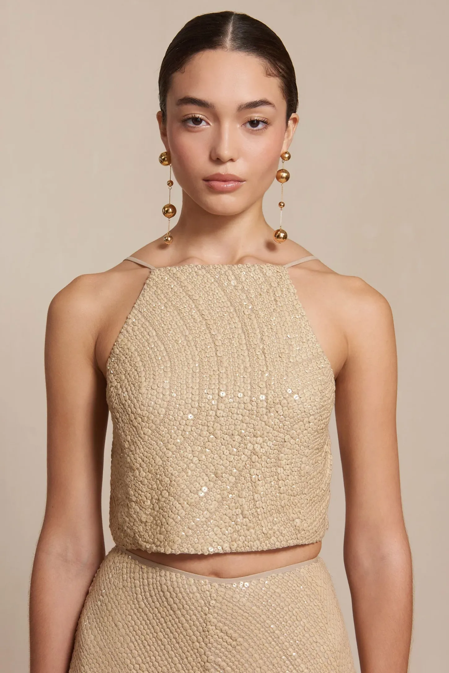 The Poli Top is an abstract sequined halter top with a halter neckline and an open back that ties below the shoulders. In a neutral-hued sequin pattern, pair with the Killa Pant and dance the night away.