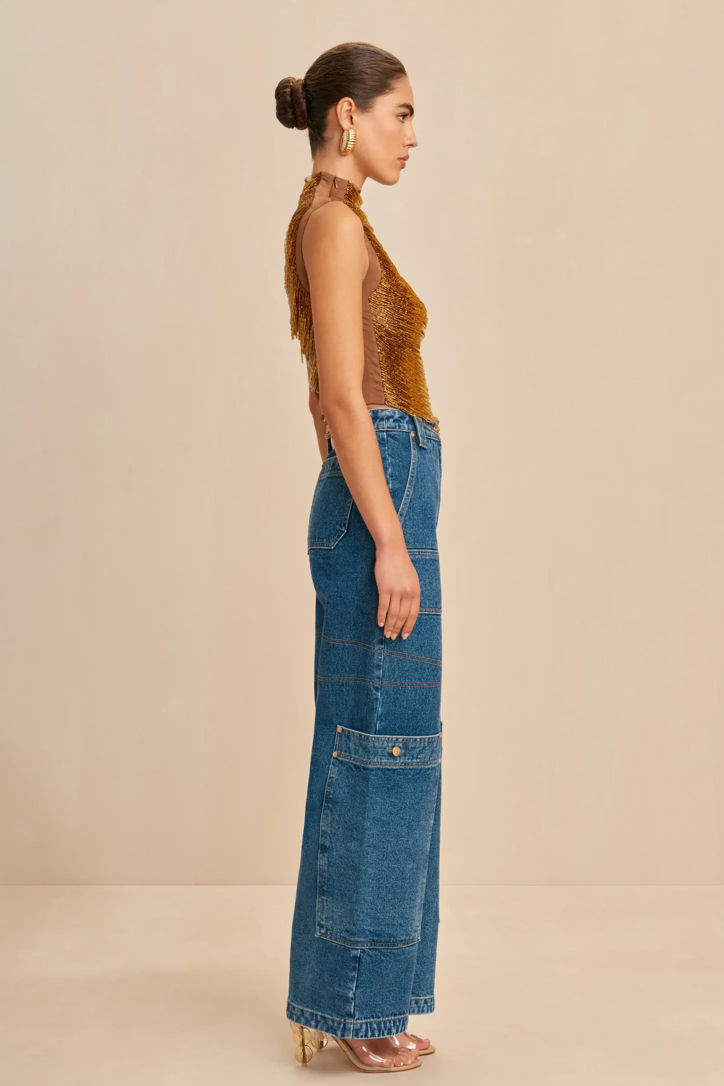 Taraji is an artisanal top rendered in hand beaded ombre arcs over a mesh underlayer. The dark-to-light hand-beading and slight arching of the threads creates an ultra-slimming effect. The discrete mesh underlayer offers coverage without distracting from the stunning beadwork or transparent effect. 2 zippers on either side of the neck provide for easy wear. Contrast fabric down the neck, shoulders and sides creates a complimentary effect and matches the Bisou Pant in Gold to complete the look.