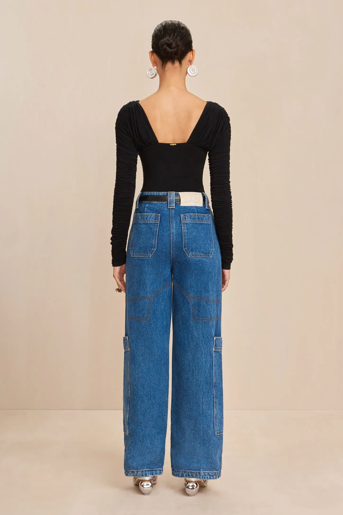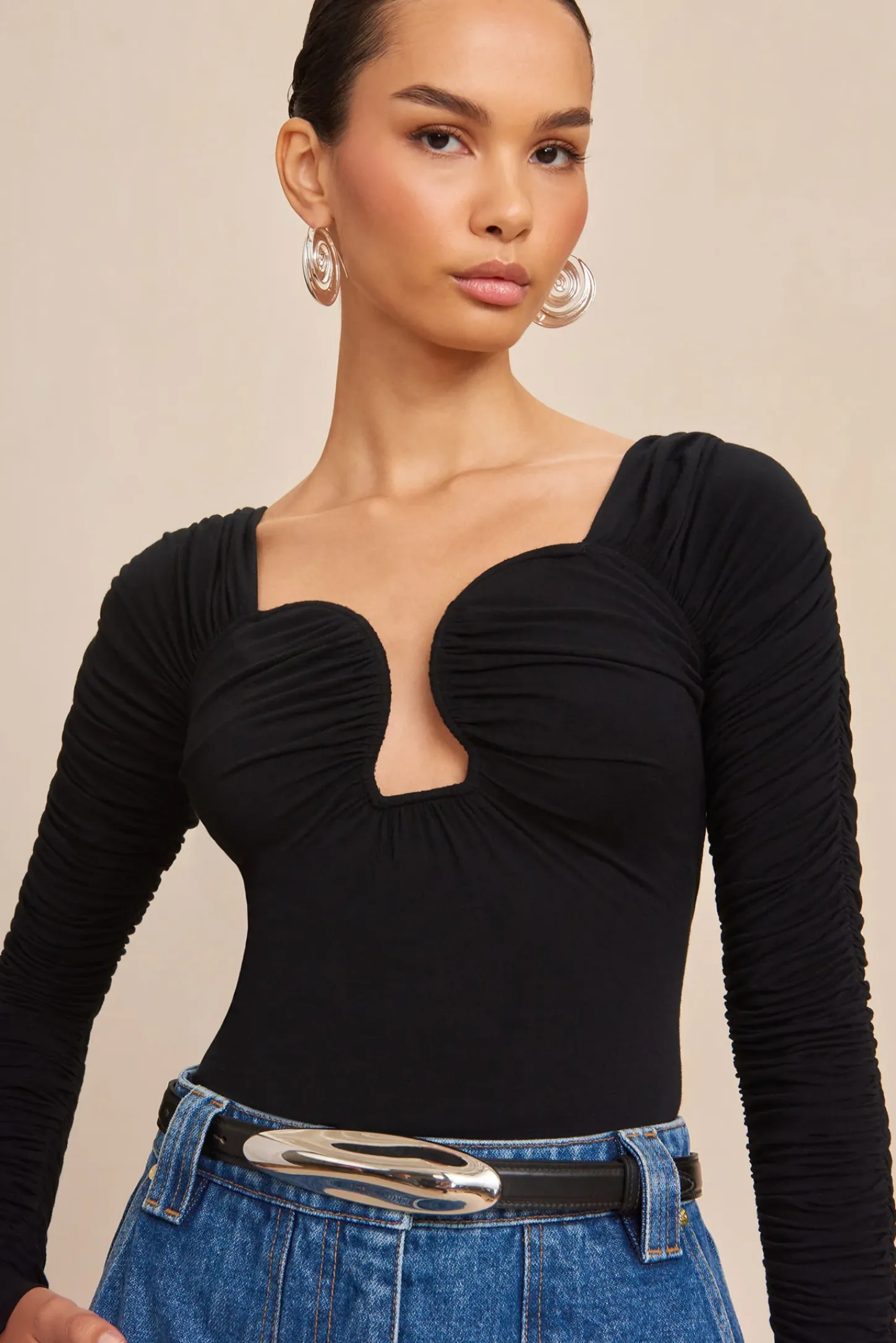 A long-sleeved body suit with geometric, wired neckline, gathered bust and low back in Black.