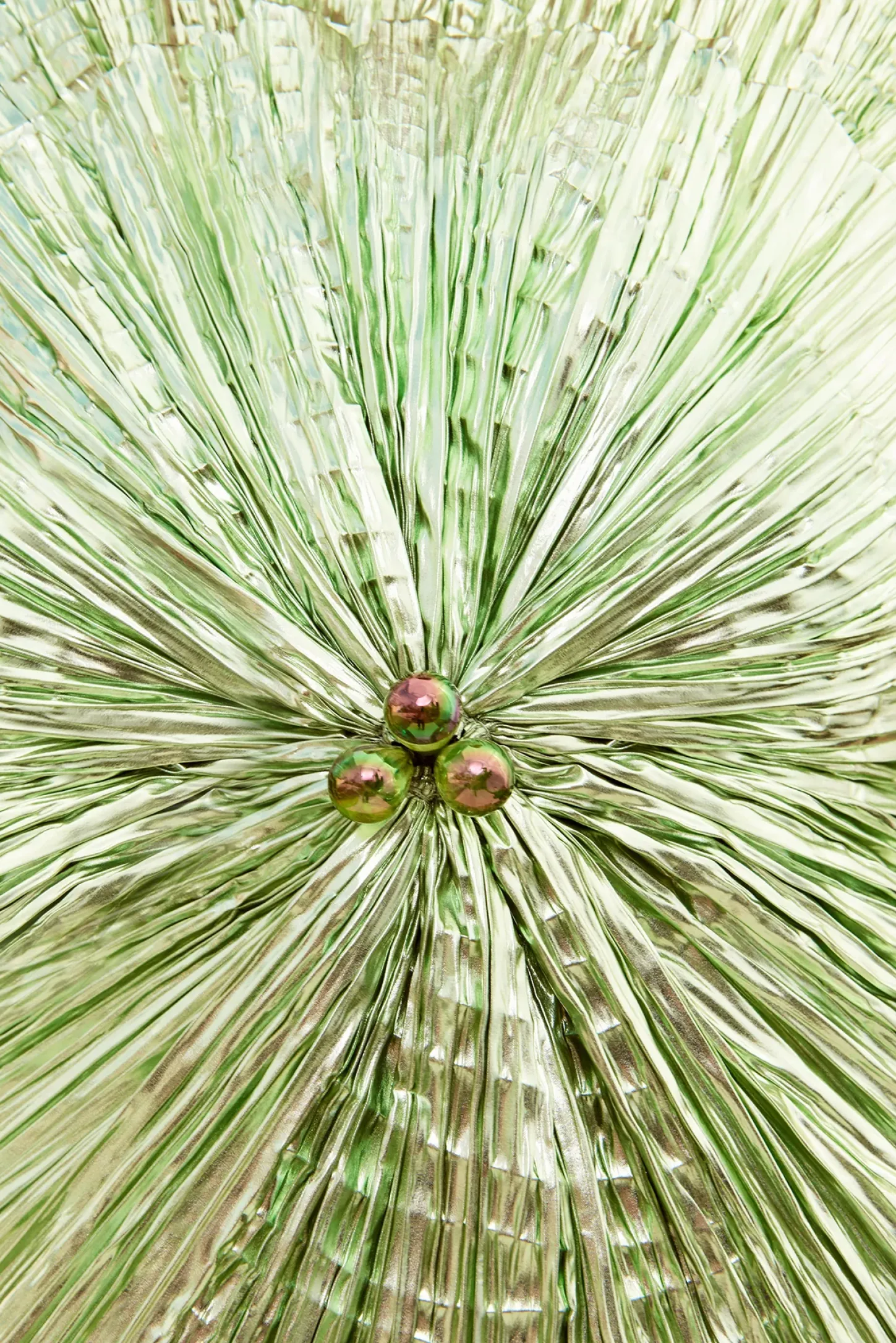 The Anthos is a coquillage top that bursts outwards from a central, teardrop bead detail. The metallic plisse fabric captures the light and provides high shine in spearmint metallic hues. The adjustable shoulder straps and central back tie allow for customized fit. Pair with the Omid skirt to complete the look.