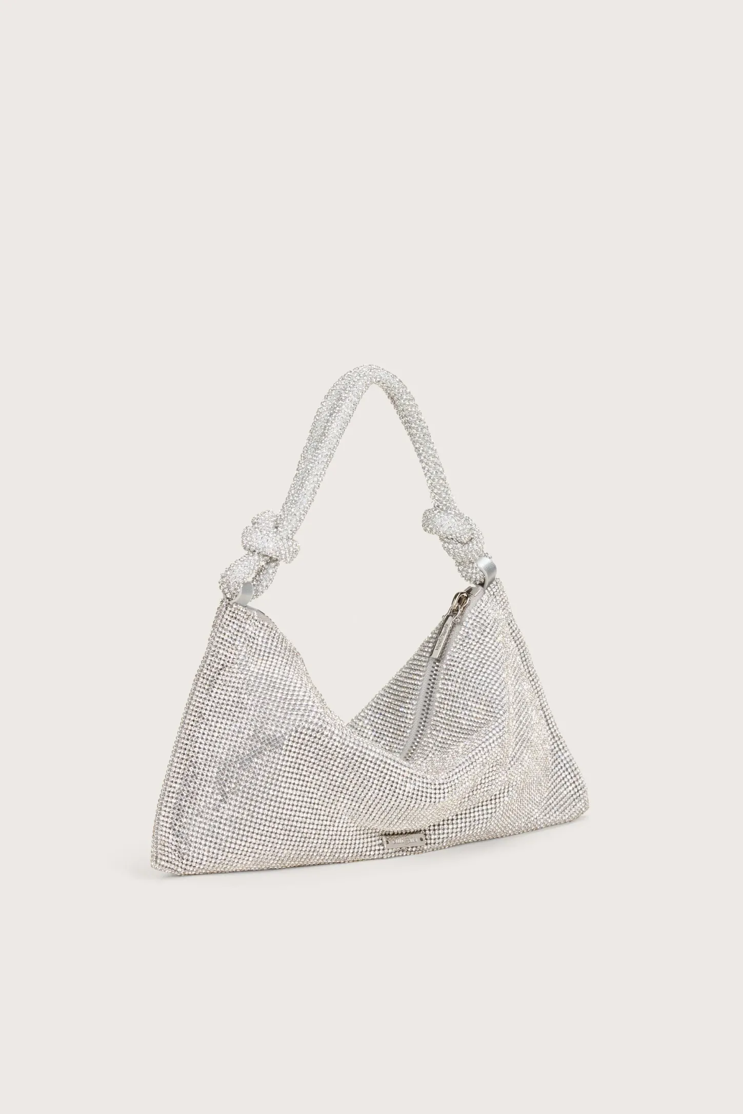 The Hera Shoulder, now available in an even smaller Nano. Crafted from eye-catching rhinestone that give a metallic silver shine, this classic design exudes femininity and grace with a knotted shoulder strap and a gorgeously slouchy silhouette. The frosted handheld bag is the perfect addition to add some Gaia sparkle to your life. Please note this size is much smaller than the Mini.