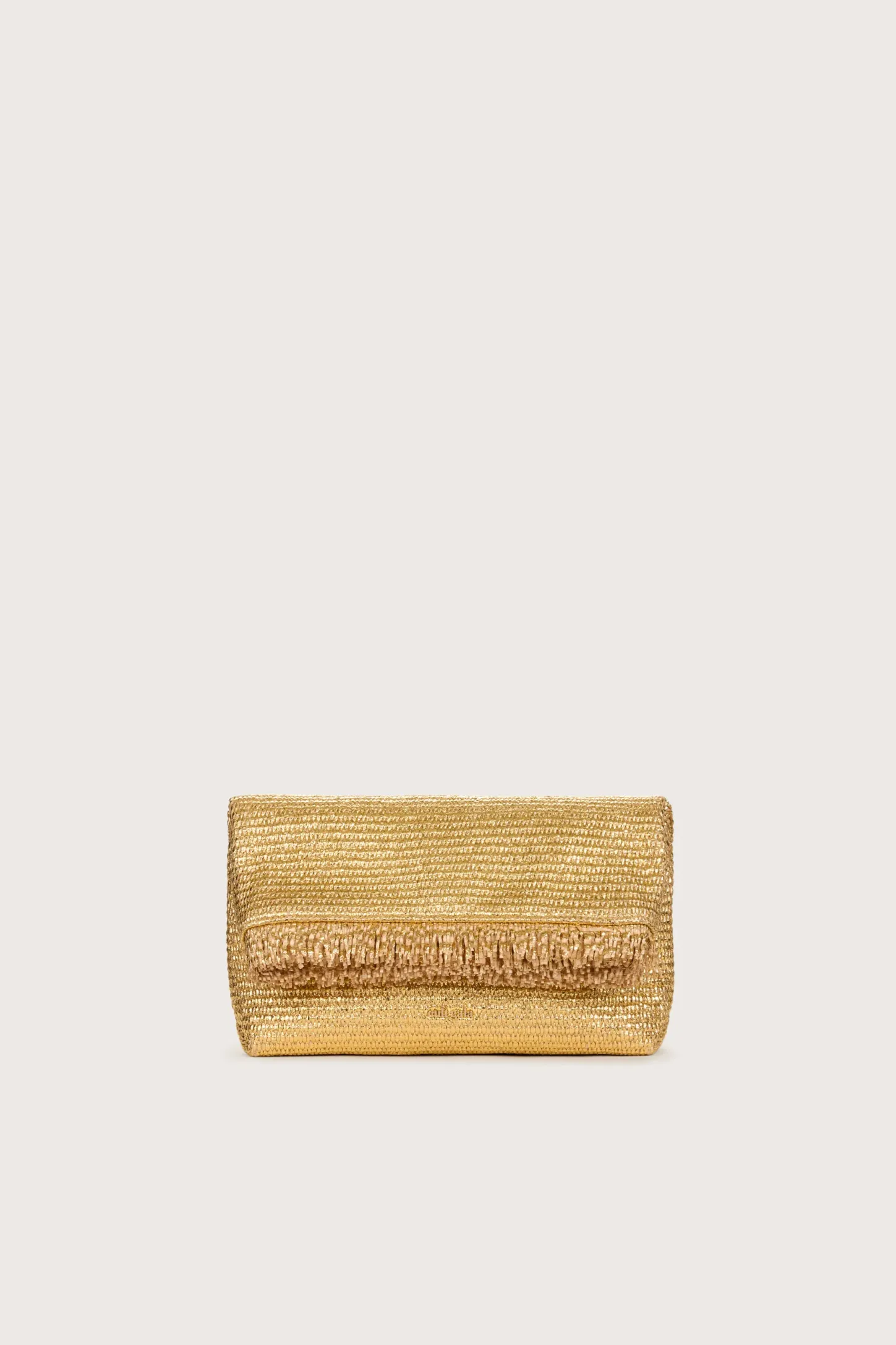 A mini gold painted raffia clutch with a natural raw edge fringe.