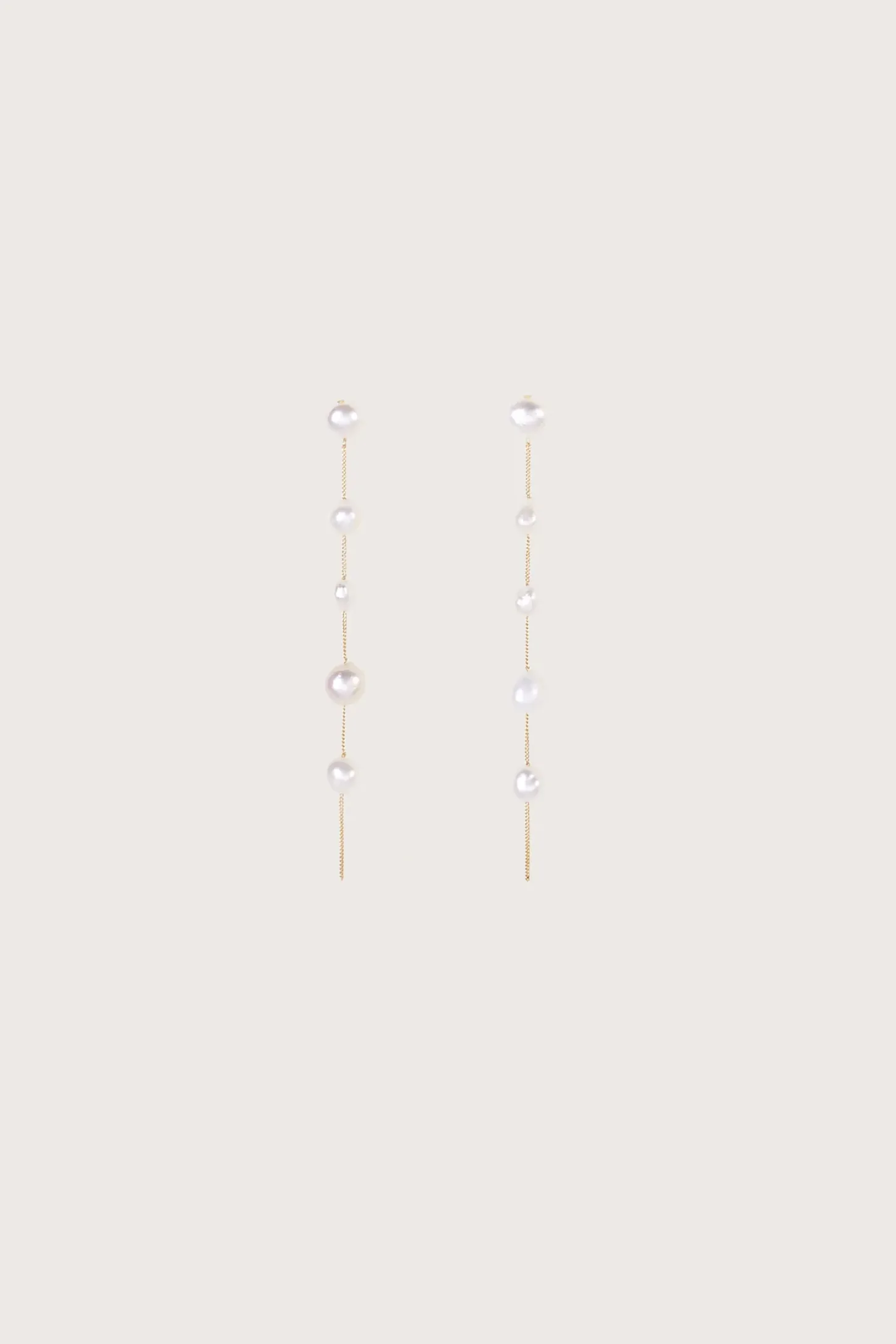The Atum Earring has a stunning collarbone-grazing silhouette cast from brushed brass dotted with lustrous freshwater pearls. One of a kind, no two are alike.
