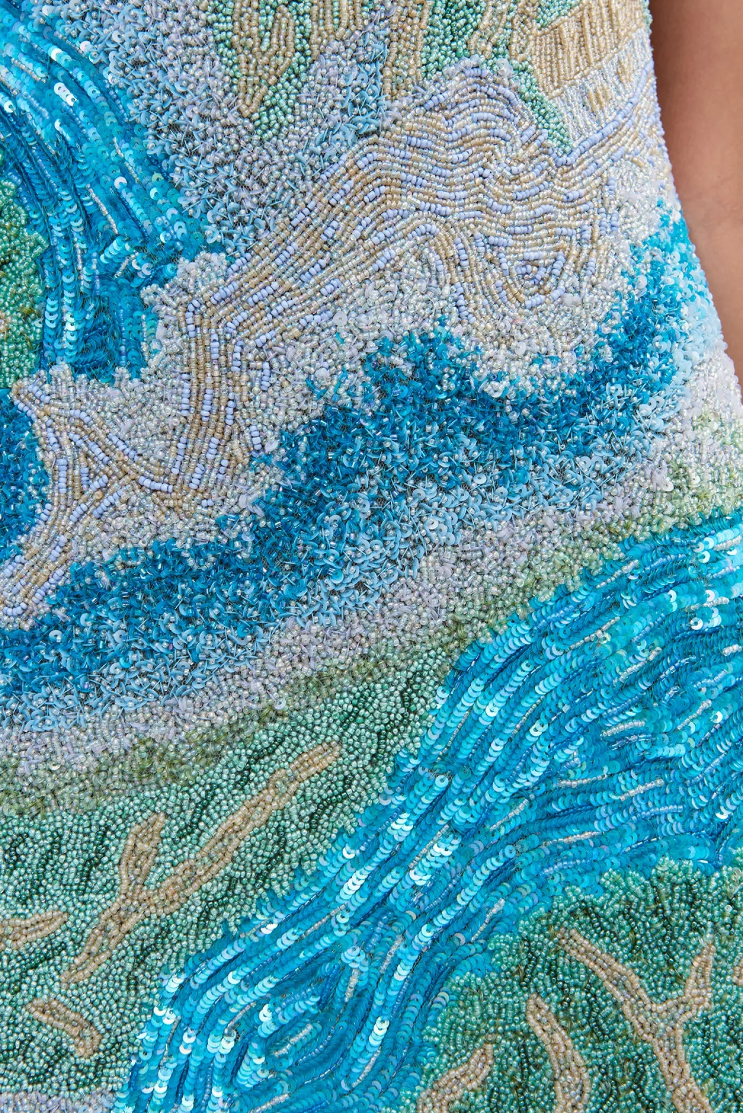 Blow them away with Bebe. This mini-dress features hand crafted bead and sequin work in the landscape pattern. This artisanal pattern and materials offer shine and texture. She has a square neckline in the front and slightly slouchy back. A side zip allows for easy wear. Bebe is the perfect party dress and is guaranteed to have all eyes on you.