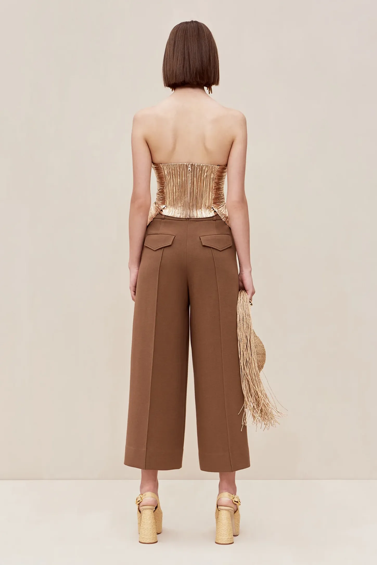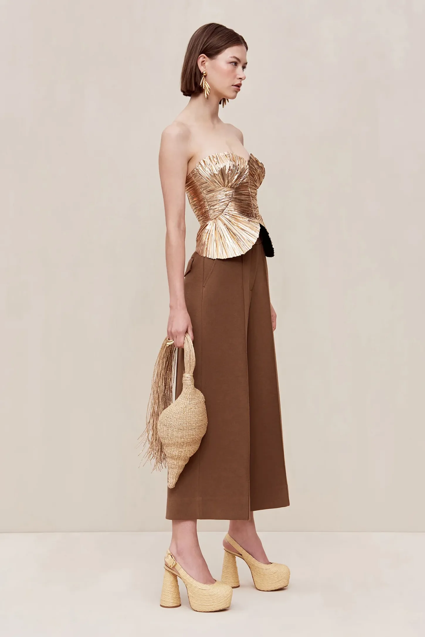 The Jace Top shines in metallic plissé. The vertical folding at the bust is balanced by a sweetheart neckline and a highly-structured corset top. The stunning fabric and construction create an ultra-slimming effect. Vertical pleating hides the zip at the central back that provides easy wear.