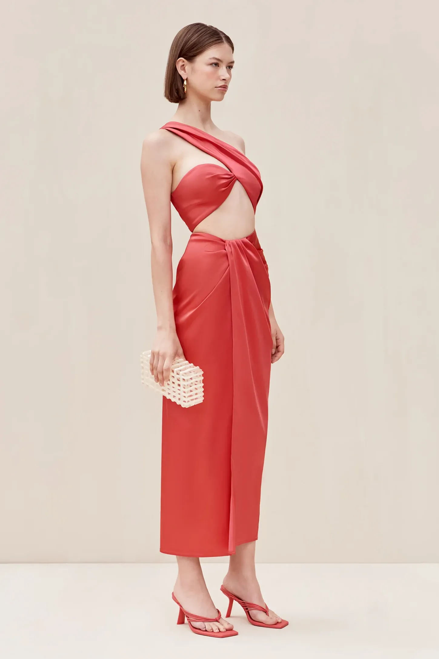 Avianna is an artistic piece at the intersection of asymmetry and classical silhouettes. This dress in Sunkiss hues is lined in the upper body and is slightly stretchy. The over the shoulder band holds you snug. A gathering of fabric at the waist drapes down the front to provide movement and texture. A side zip allows for east wear.