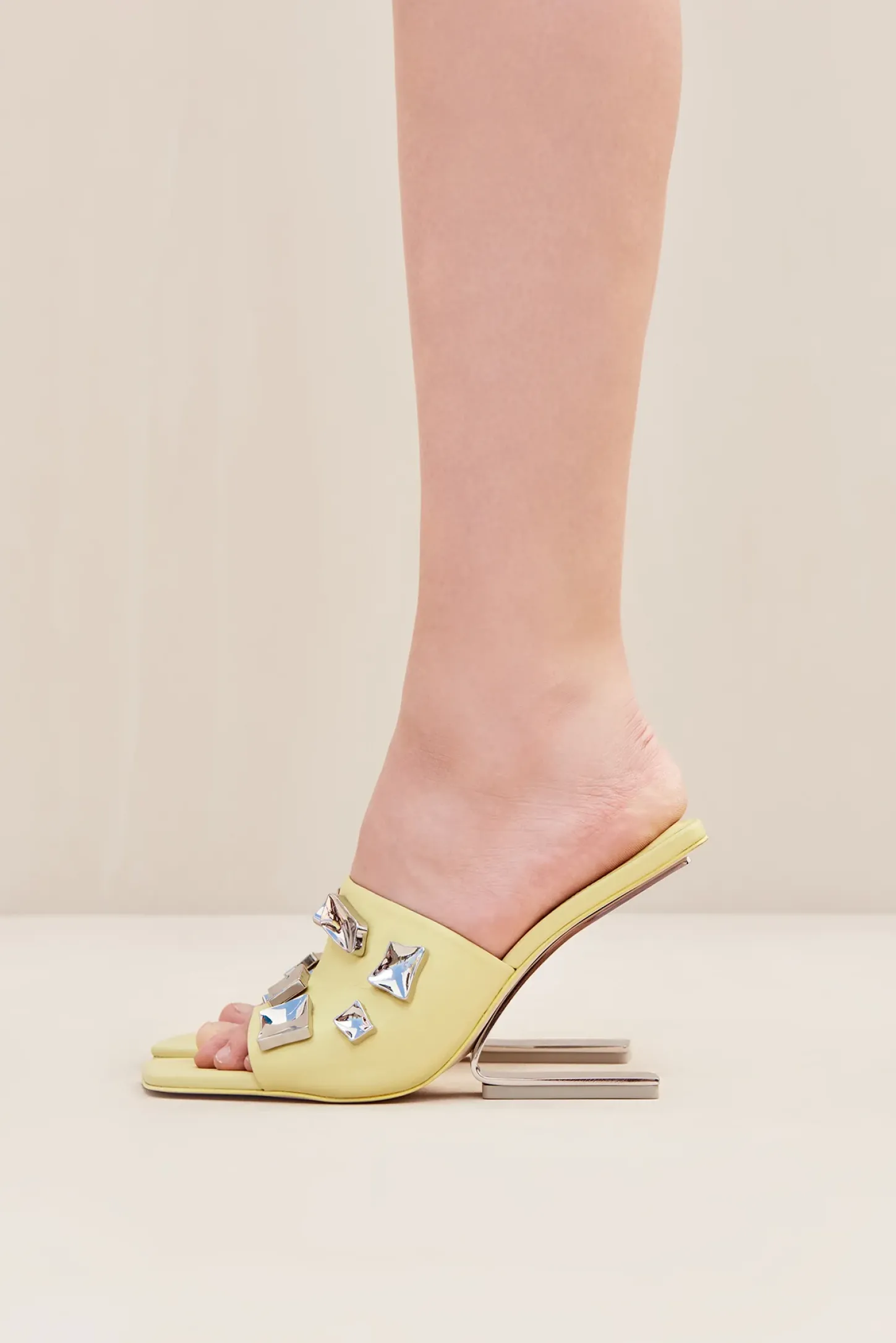 Malaya is a masterpiece balanced on an illusion heel. She features a leather exterior in vibrant Lemon sorbet. Reflective, high-shine hardware adorn her foot strap. Pair with the Malaya Anklet to enhance the effect. She will enchant your entourage.