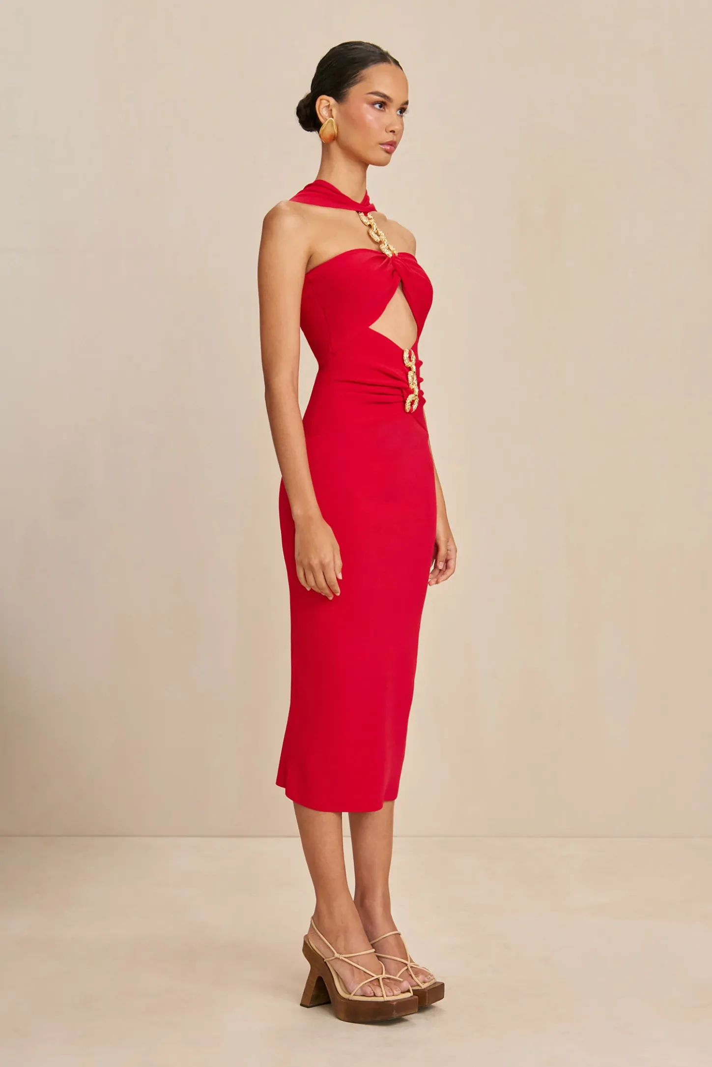 A midi-length knit dress with gold-toned chain-link hardware, high neck, and central cutout.