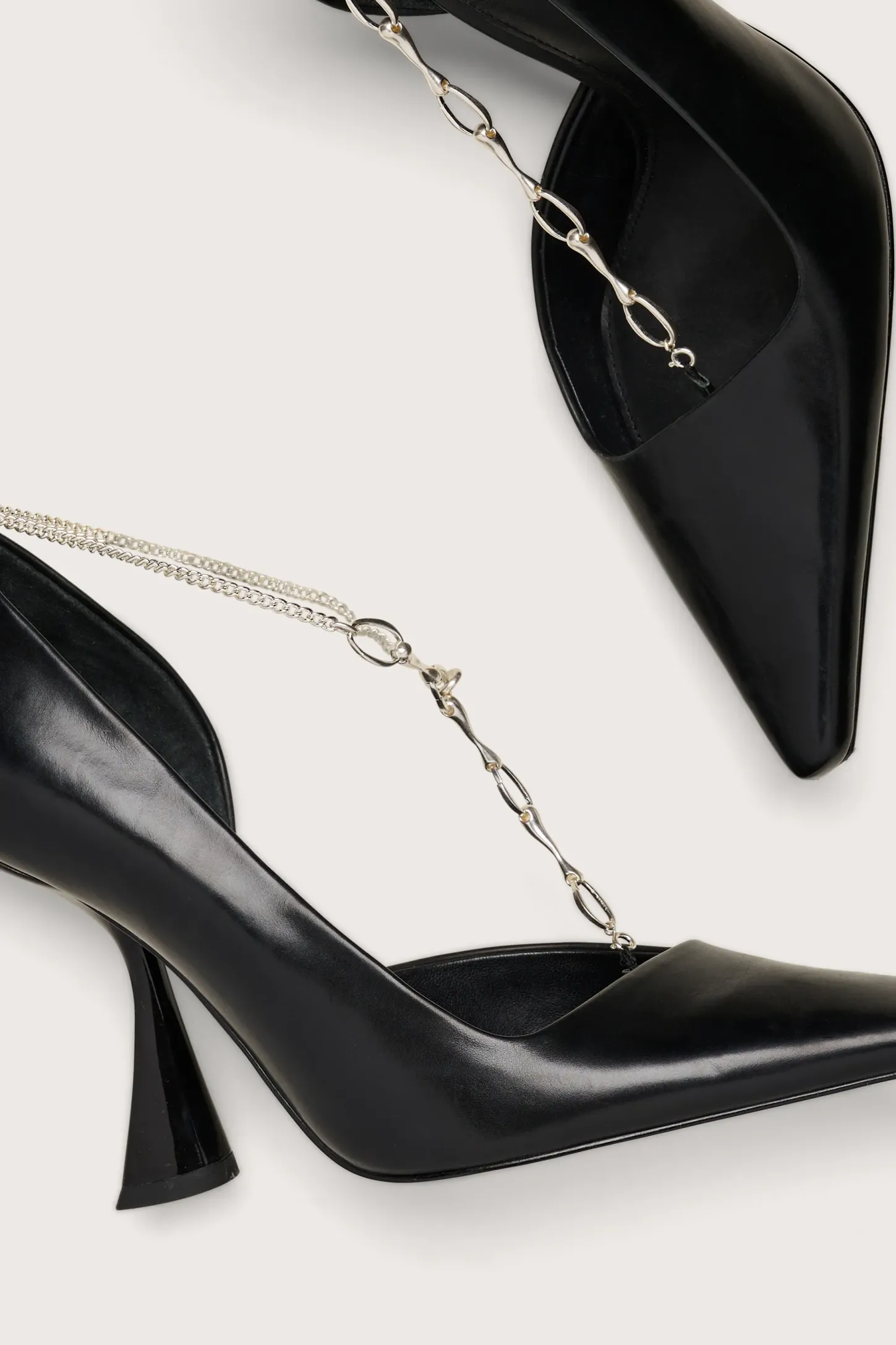 A smooth leather pump with architectural comma-heel and silver-toned chainlink toe strap.