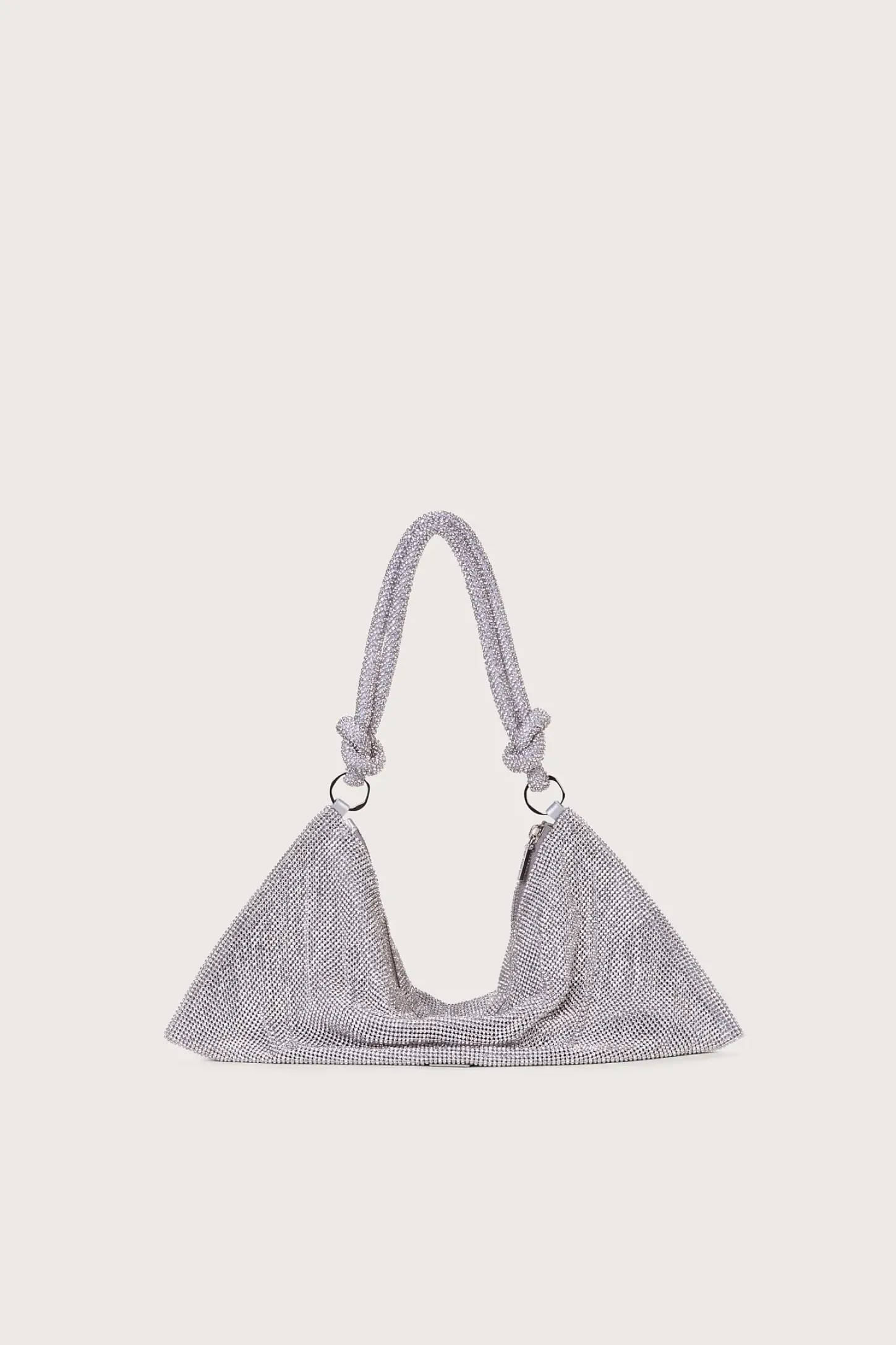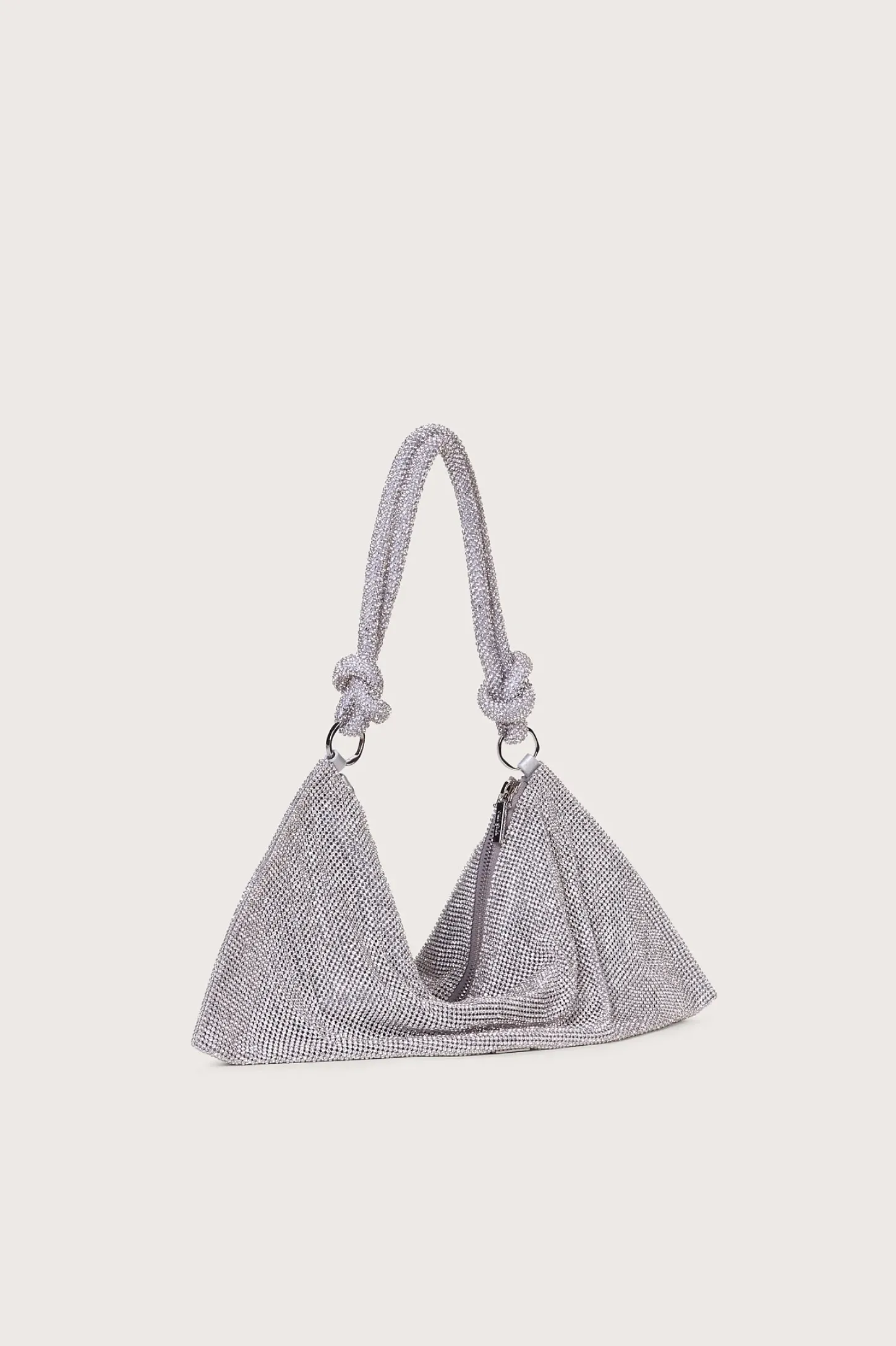 Introducing the Hera Mini Shoulder. Made from eye-catching clear rhinestones that give a metallic silver shine, it’s designed with a knotted shoulder strap and a slouchy silhouette that will store all your daily essentials.