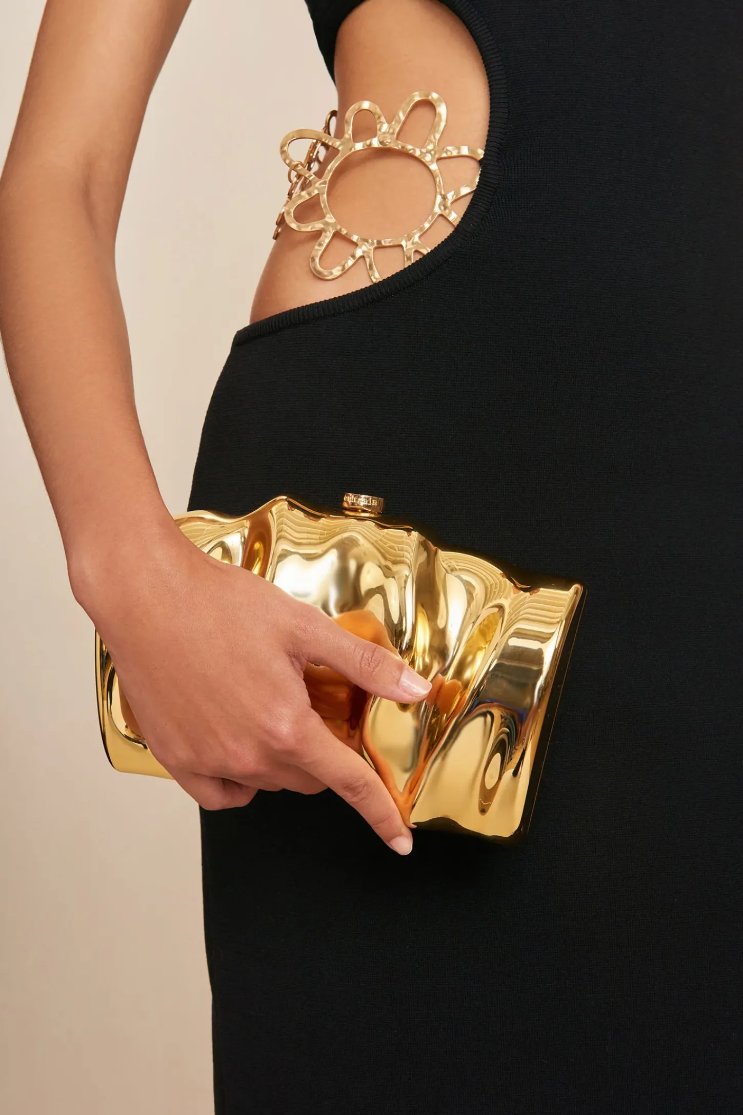 A molded scrunch shape forms the shiny gold metallic shell of this handheld clutch.