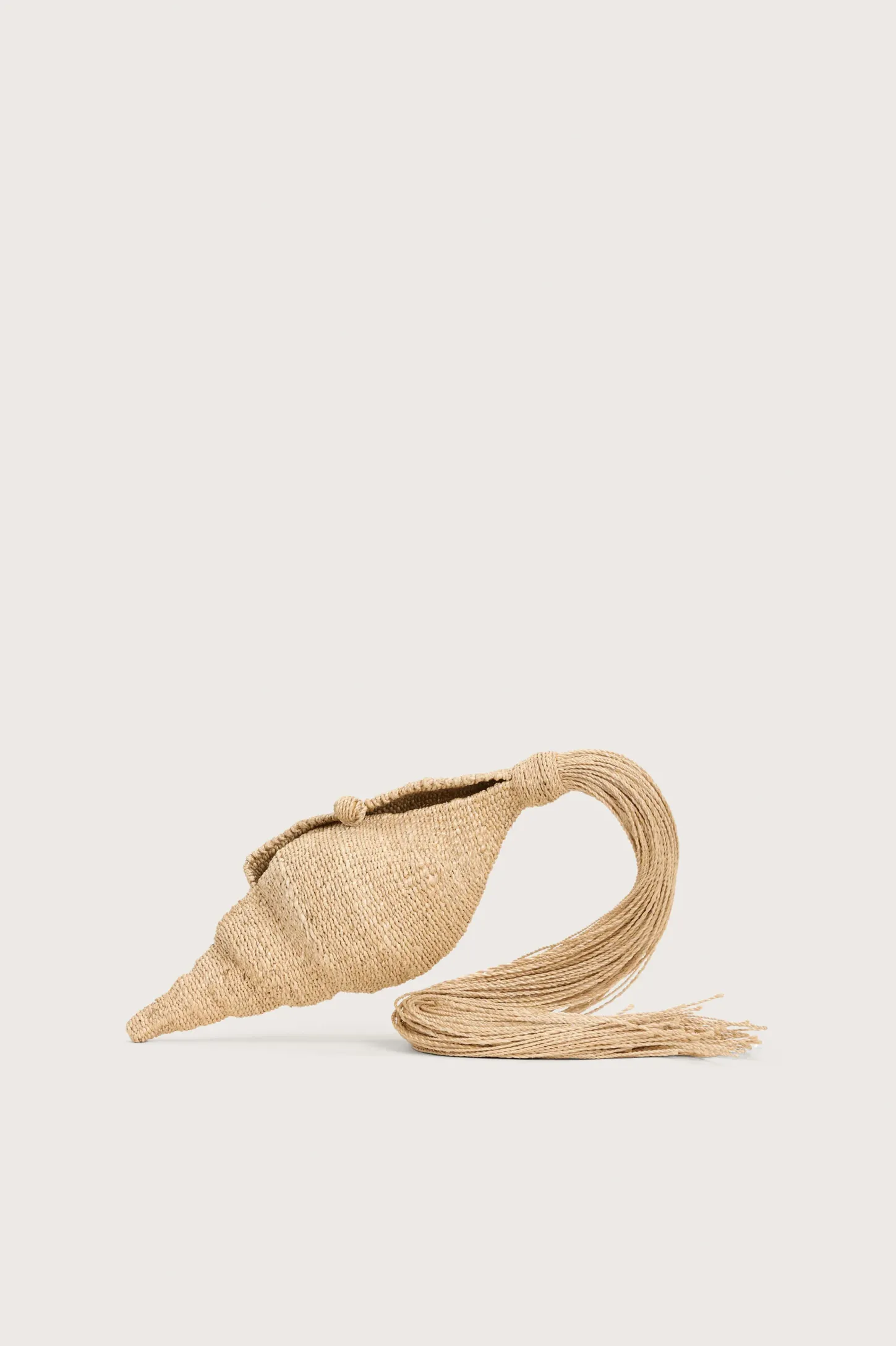 Camilla is an artistically organic clutch. This shell shaped bag has a cotton sac lining with a drawstring closure to keep your valuables safe. Her 100% abaca exterior is ultra natural. This is a must-have piece for your collection.