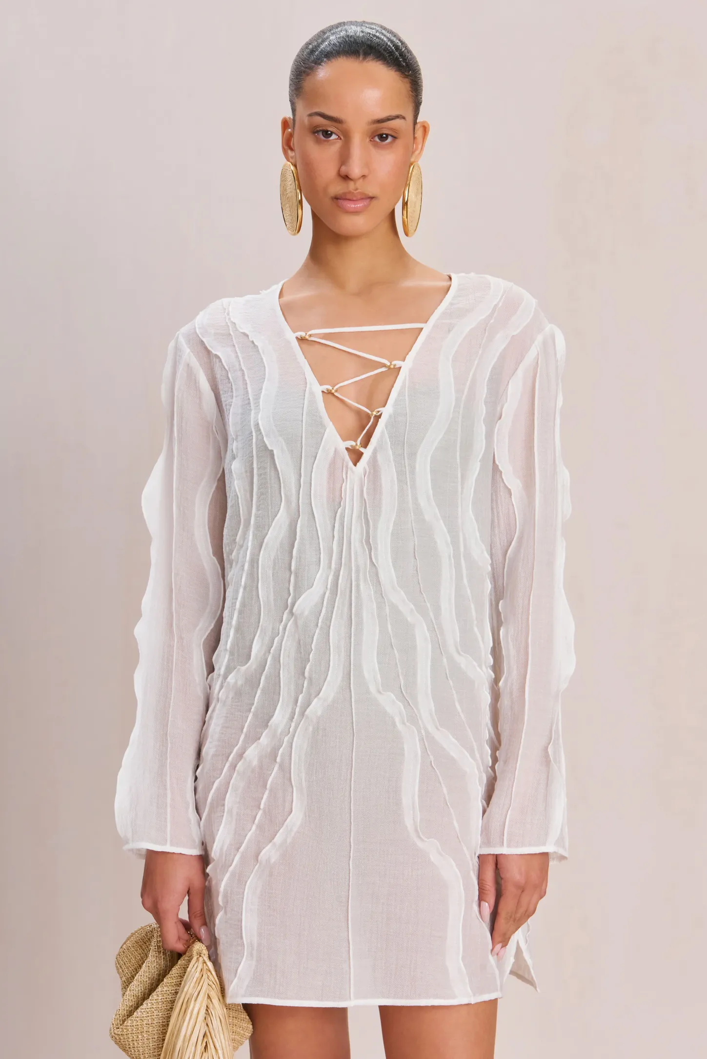 A long-sleeved, mini-length coverup featuring wavy patterns and ribbon laced through the V-neck.