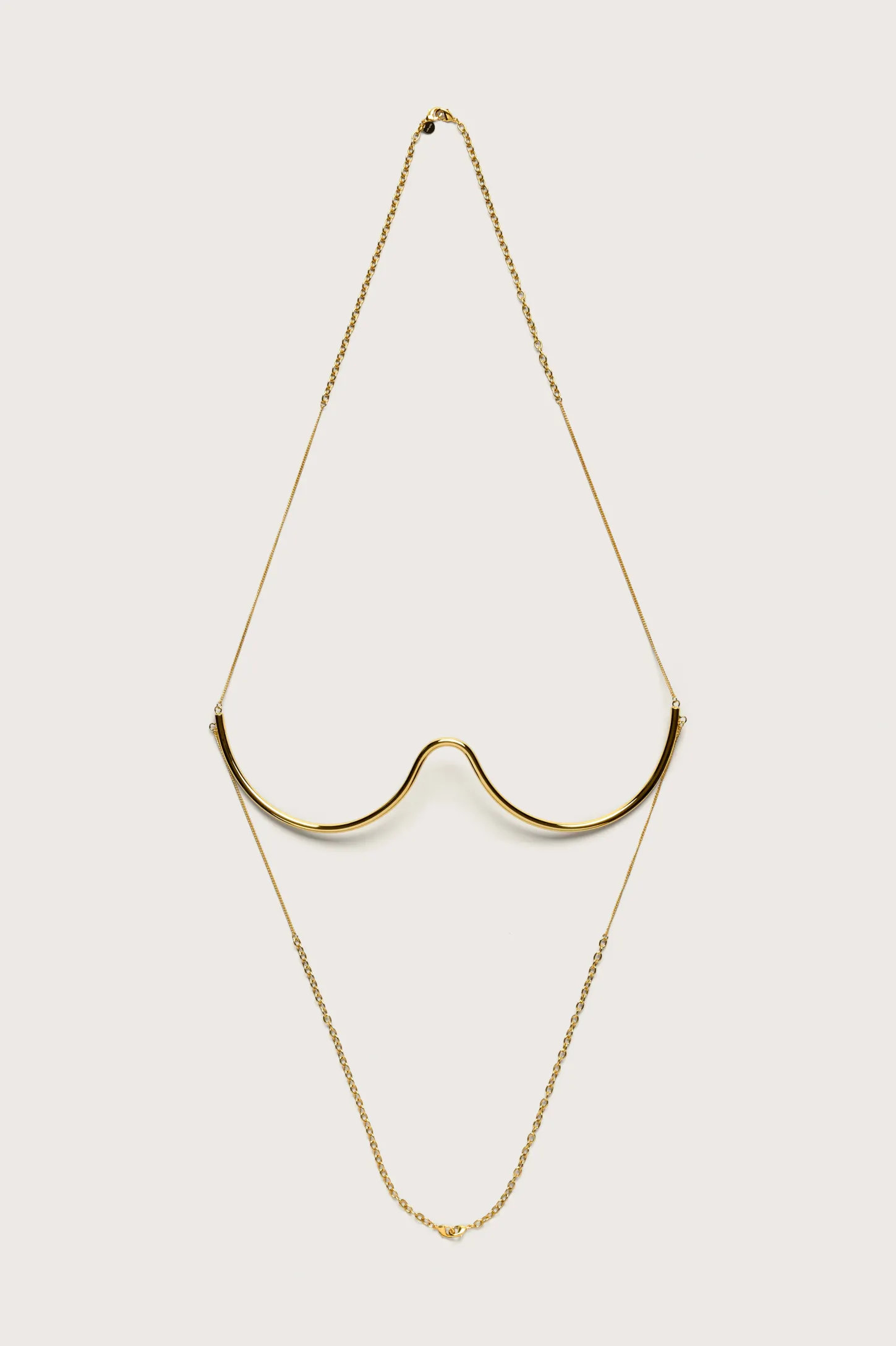 The Asha is a stunning, sculptural bralette. This halter piece features a golden bust with two chains that clasp with lobster claws behind the neck and at the back. Made for a smaller bust, fits sizes A and B best.