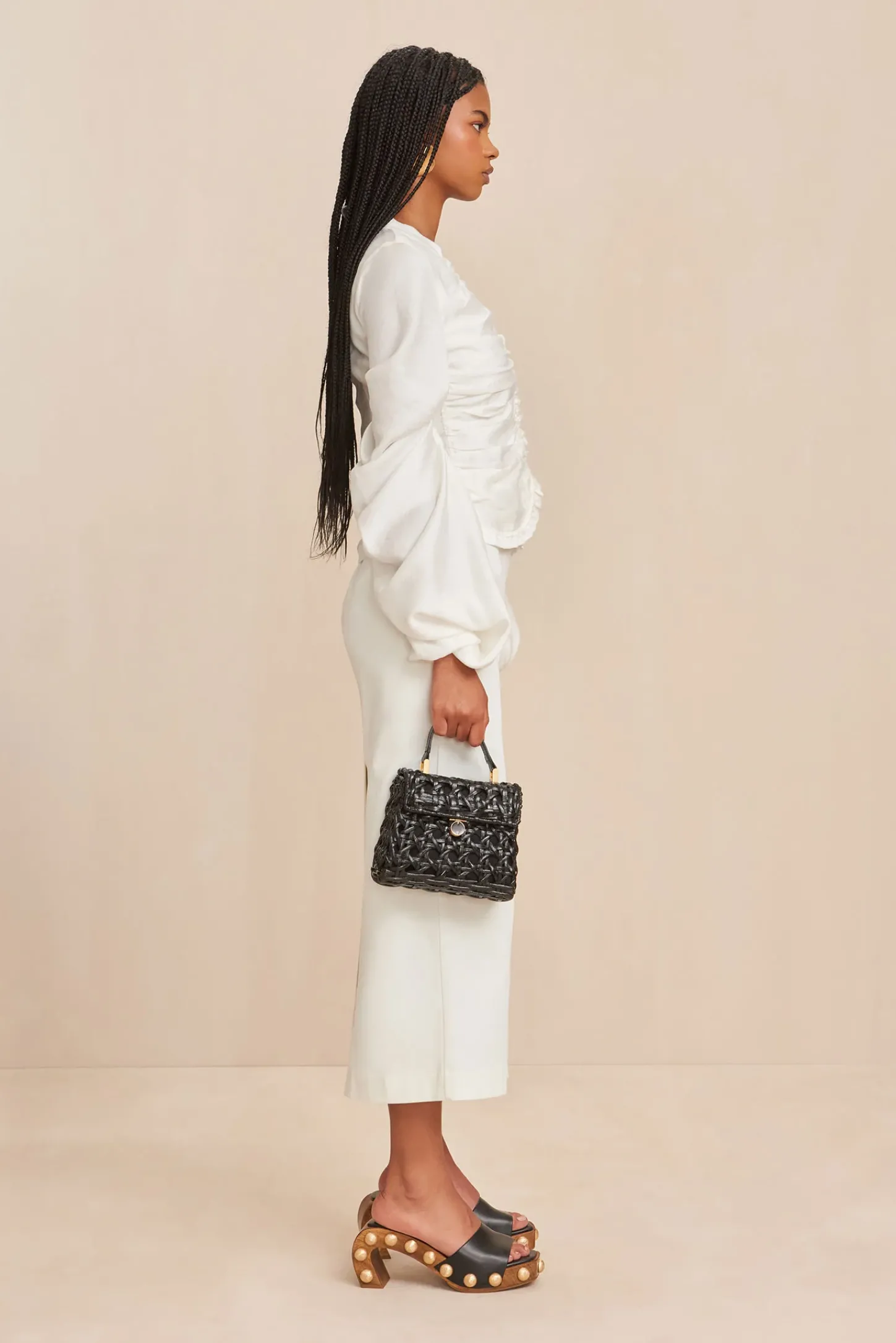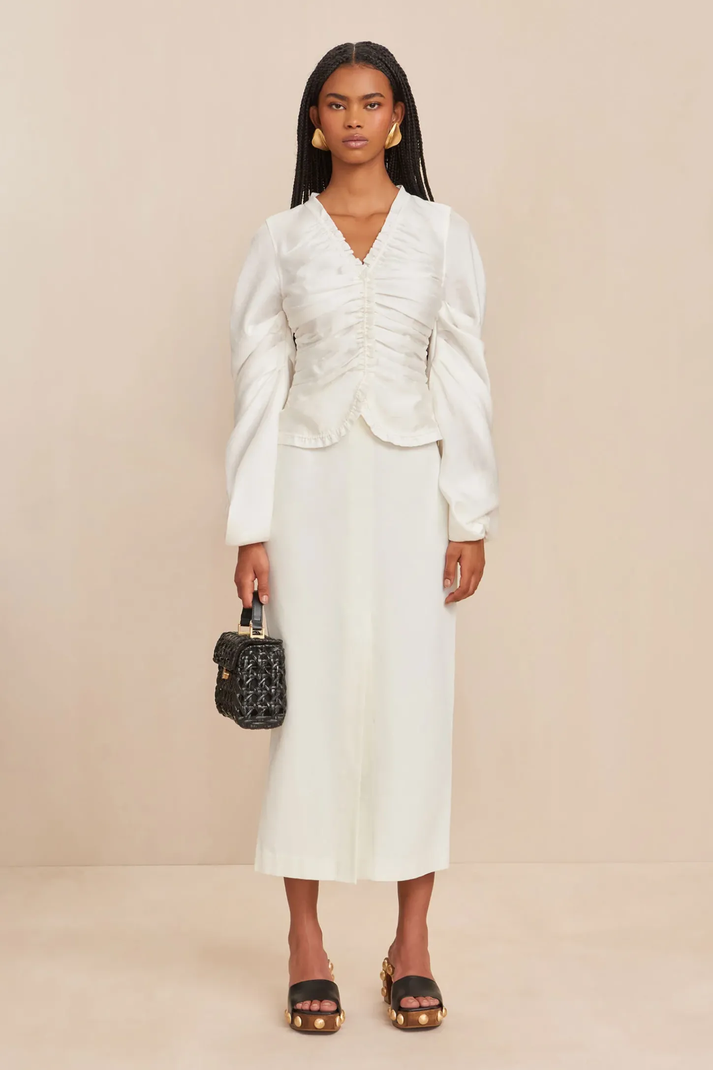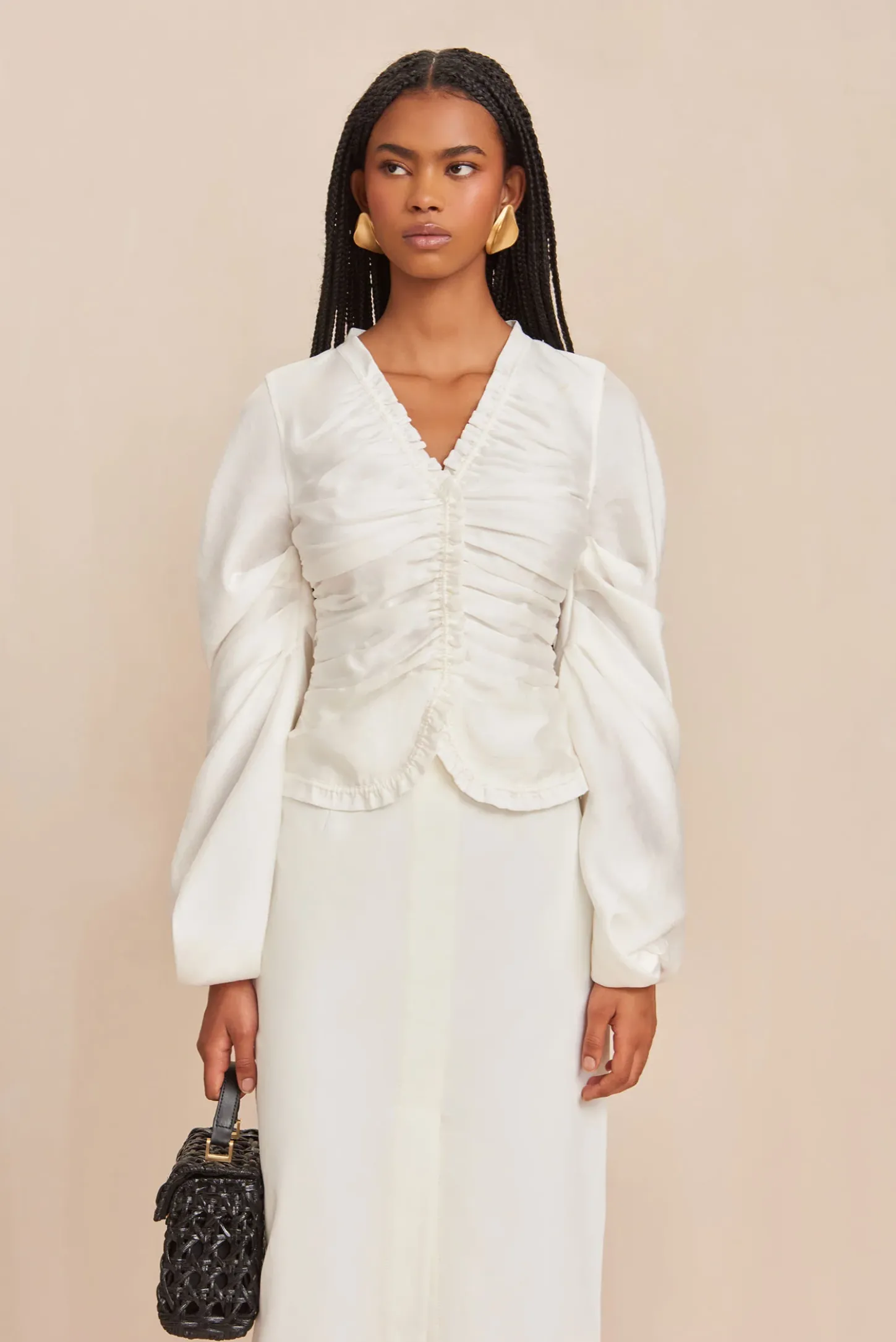 A gathered V-neck top with slightly exaggerated sleeves and ruched details.