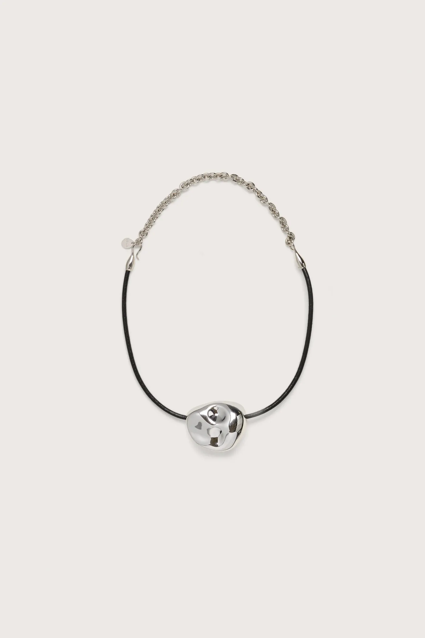Silver toned molded rock shape sits at the center of this smooth leather cording choker.