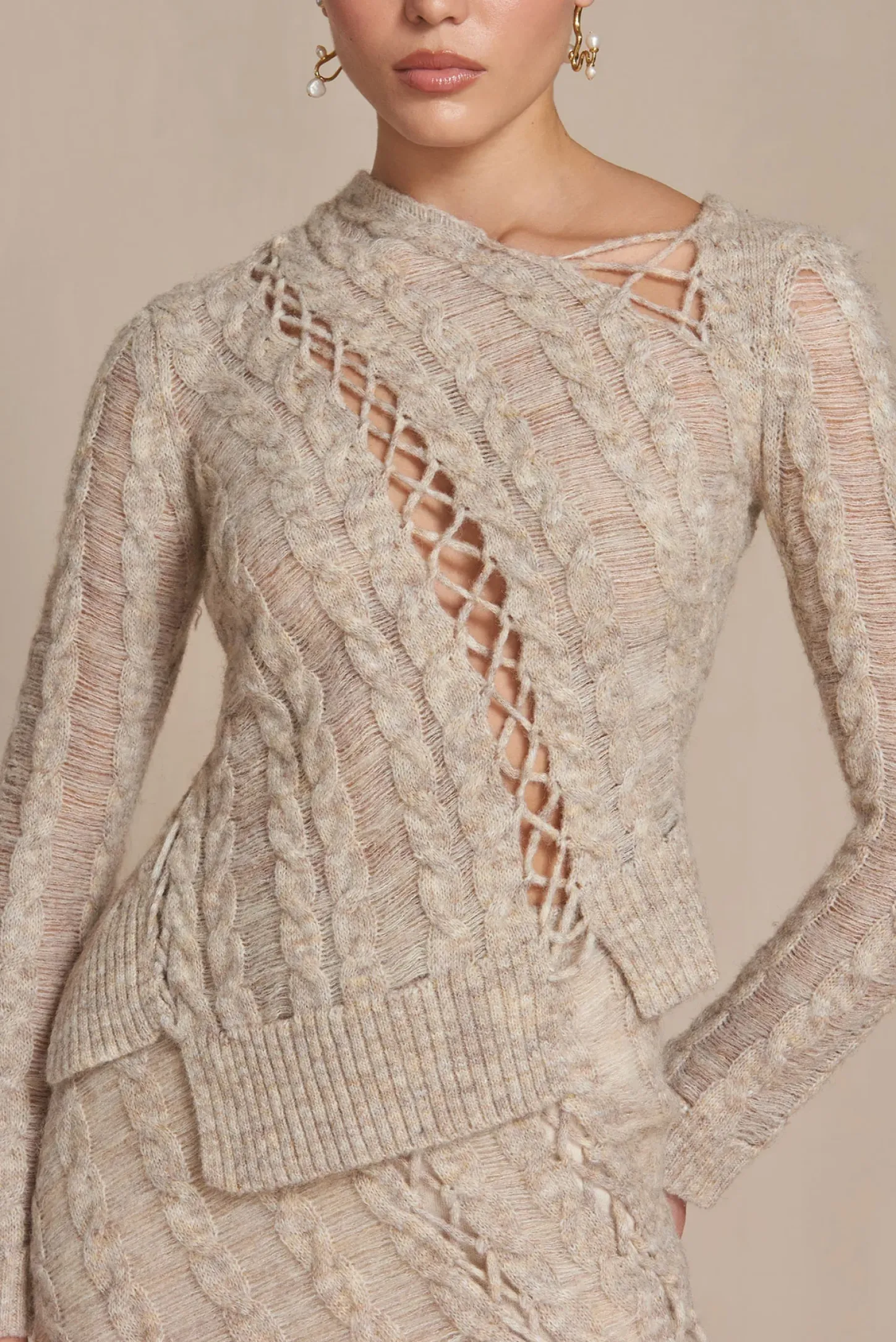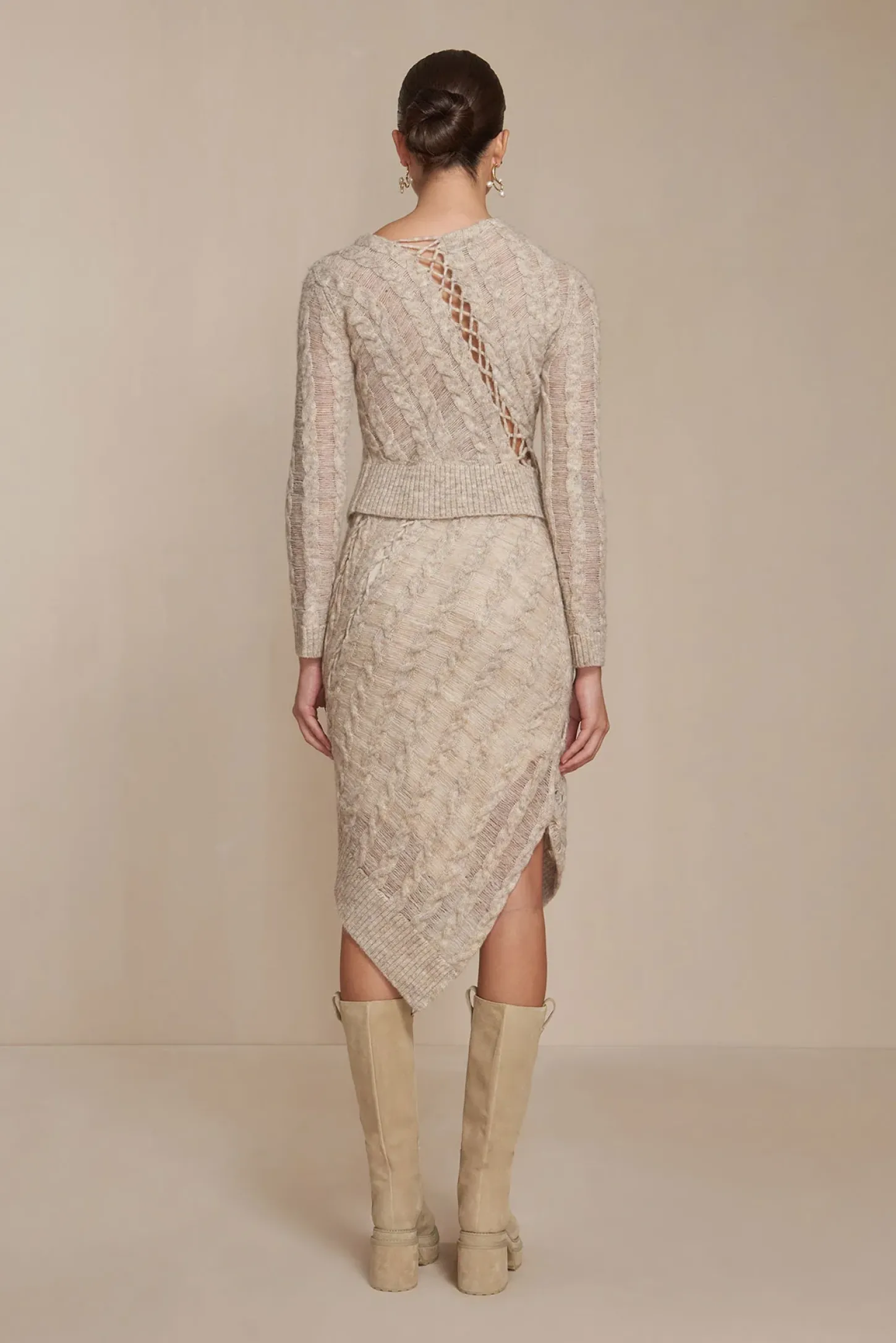 The innovative knit patterns of the Garnet Top make this piece a must-have. Her long sleeves give Garnet an Autumn elegance. The diagonal patterns through the chest and back create a flattering, yet artistic effect. The severed hemline was designed to pair perfectly with the Saphire Knit Skirt.