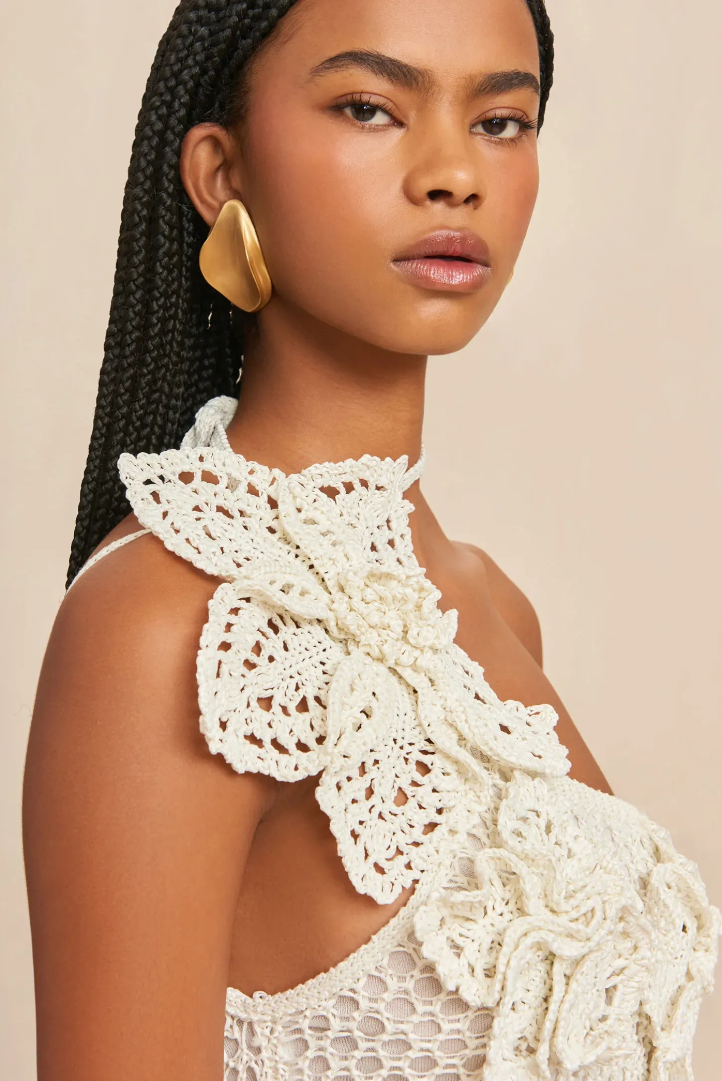 A hand-crocheted, mini-dress with large, three-dimensional knit floral motifs.