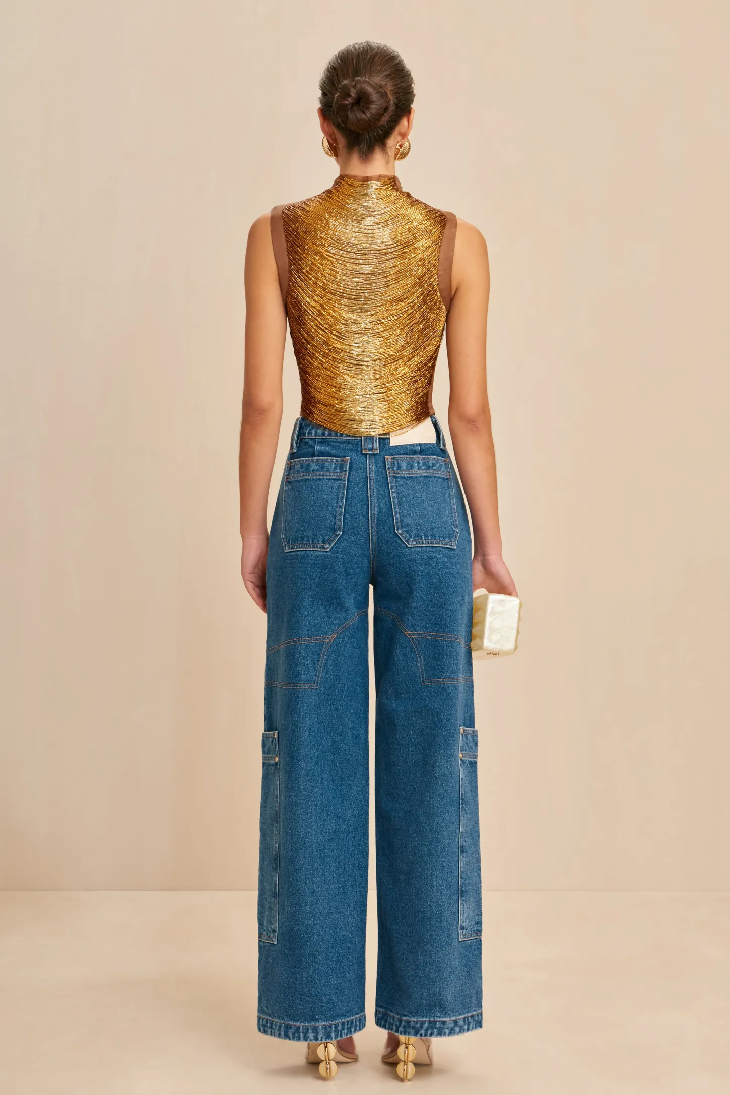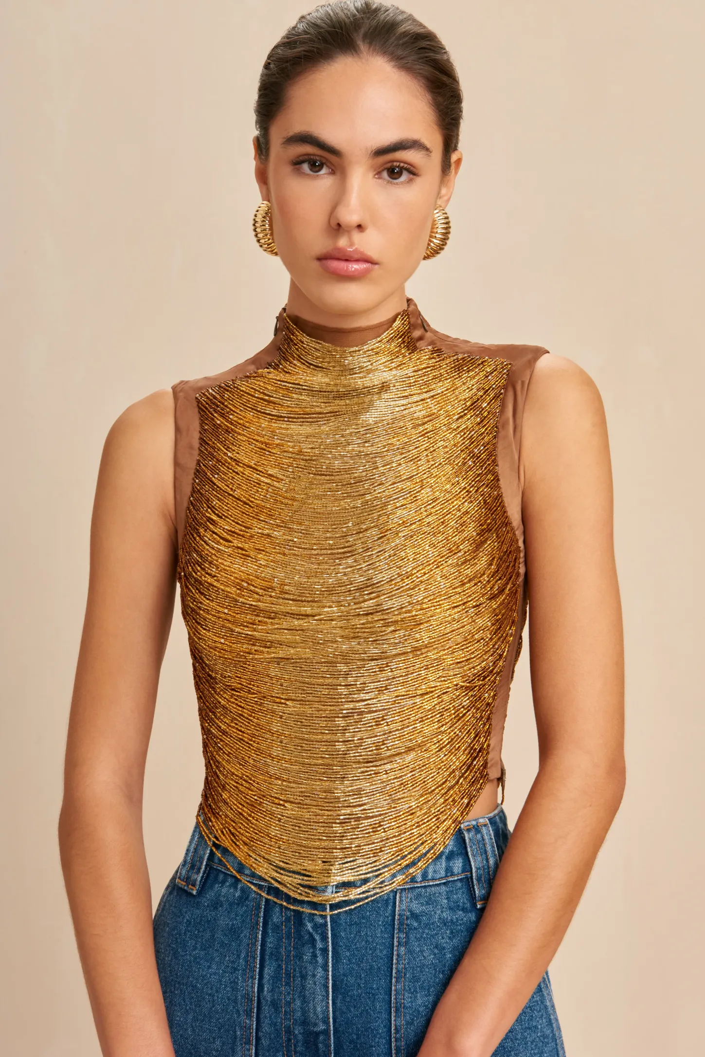Taraji is an artisanal top rendered in hand beaded ombre arcs over a mesh underlayer. The dark-to-light hand-beading and slight arching of the threads creates an ultra-slimming effect. The discrete mesh underlayer offers coverage without distracting from the stunning beadwork or transparent effect. 2 zippers on either side of the neck provide for easy wear. Contrast fabric down the neck, shoulders and sides creates a complimentary effect and matches the Bisou Pant in Gold to complete the look.