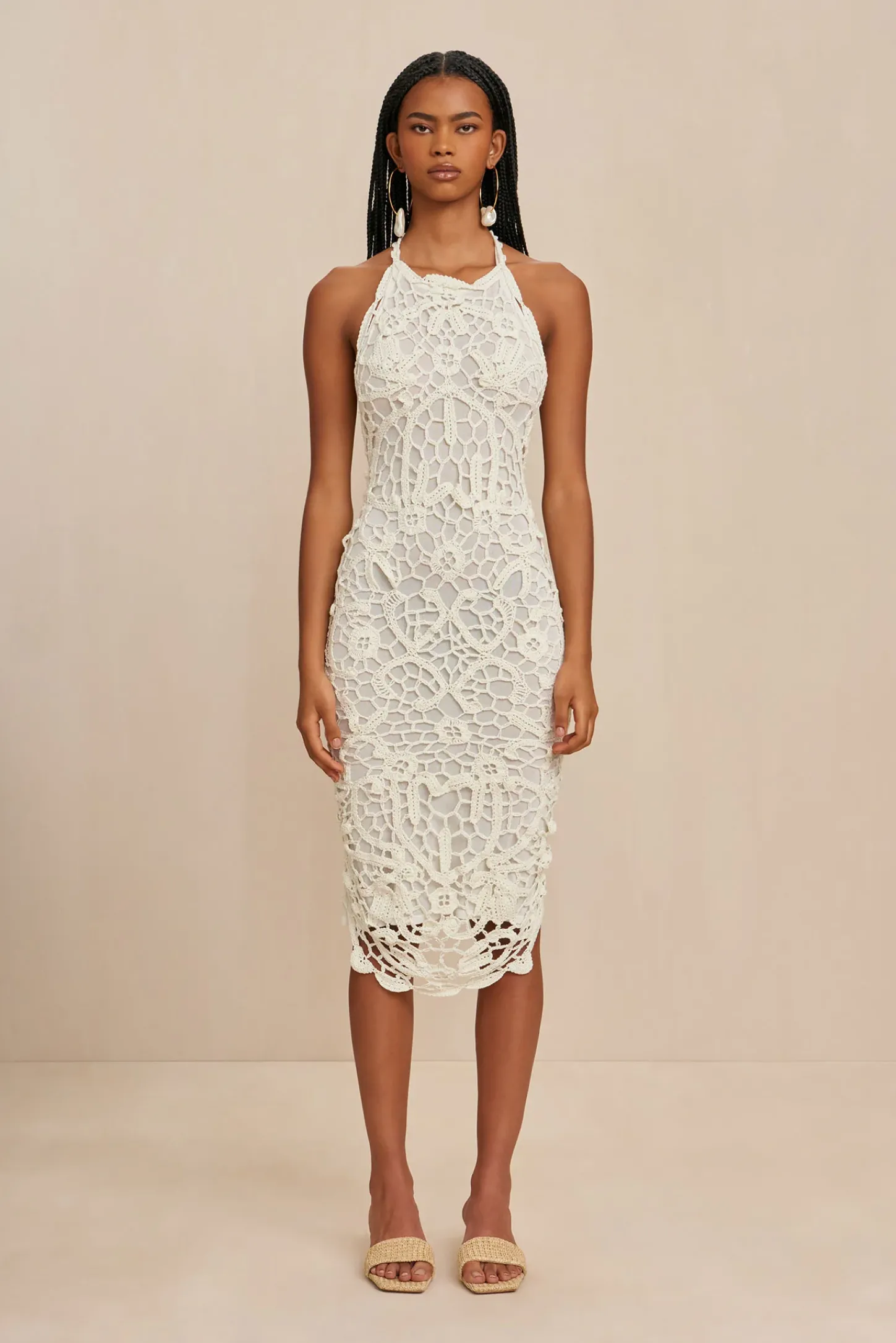 A hand-crocheted, knee-length dress with symmetrical floral and geometric designs and an irregular hem.