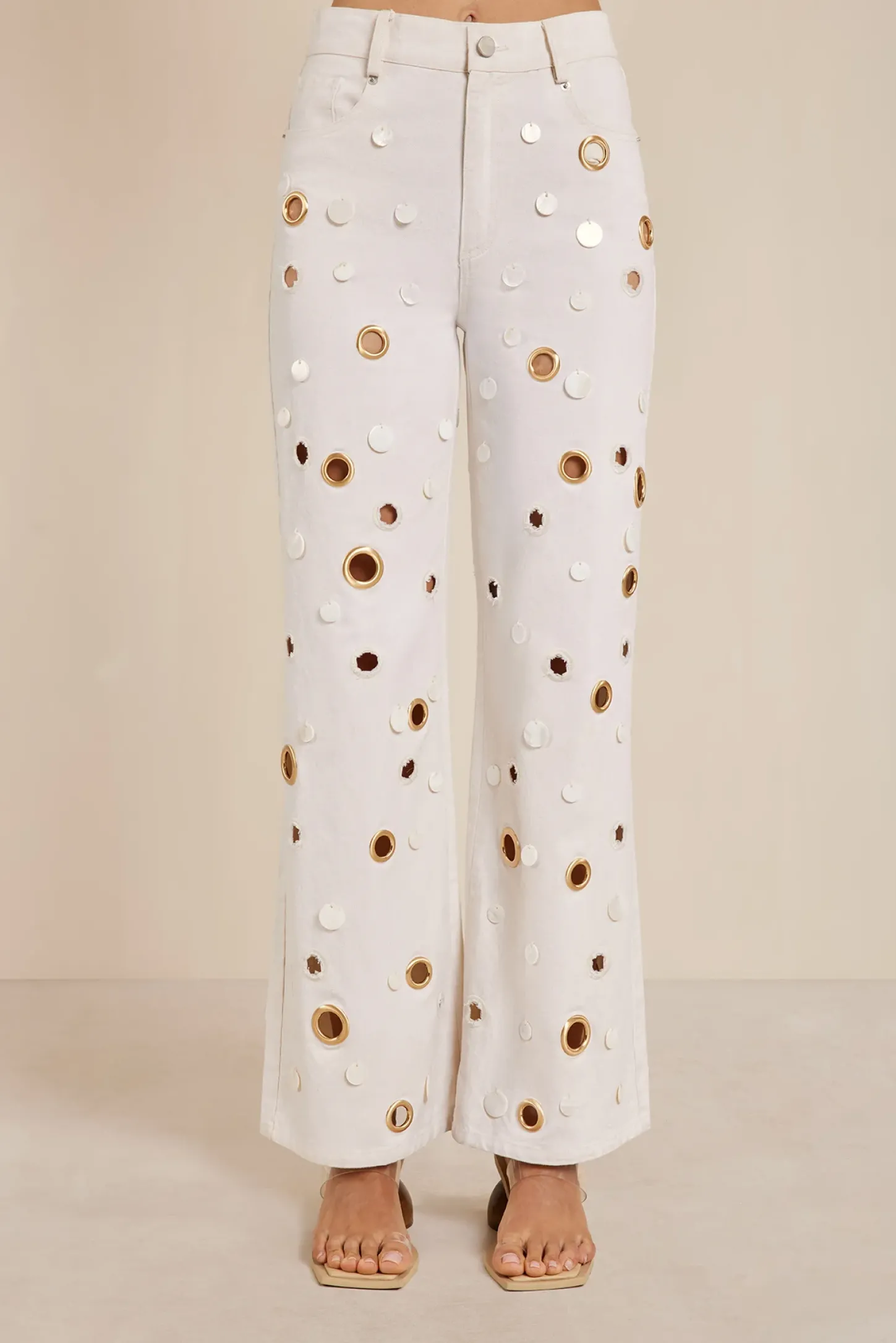 Sedna reimagines a classic wide-leg denim pant adorned with spherical brushed brass grommets and pearlescent circular shells placed artfully throughout. Dozens of small, circular cutouts of various sizes provide a textured and sculptural air. Features two front and back jean pockets, a zip-fly, a button waist closure and a CG signature at the back beltline. These unique accented high waisted denim are soon to be a wardrobe staple.
