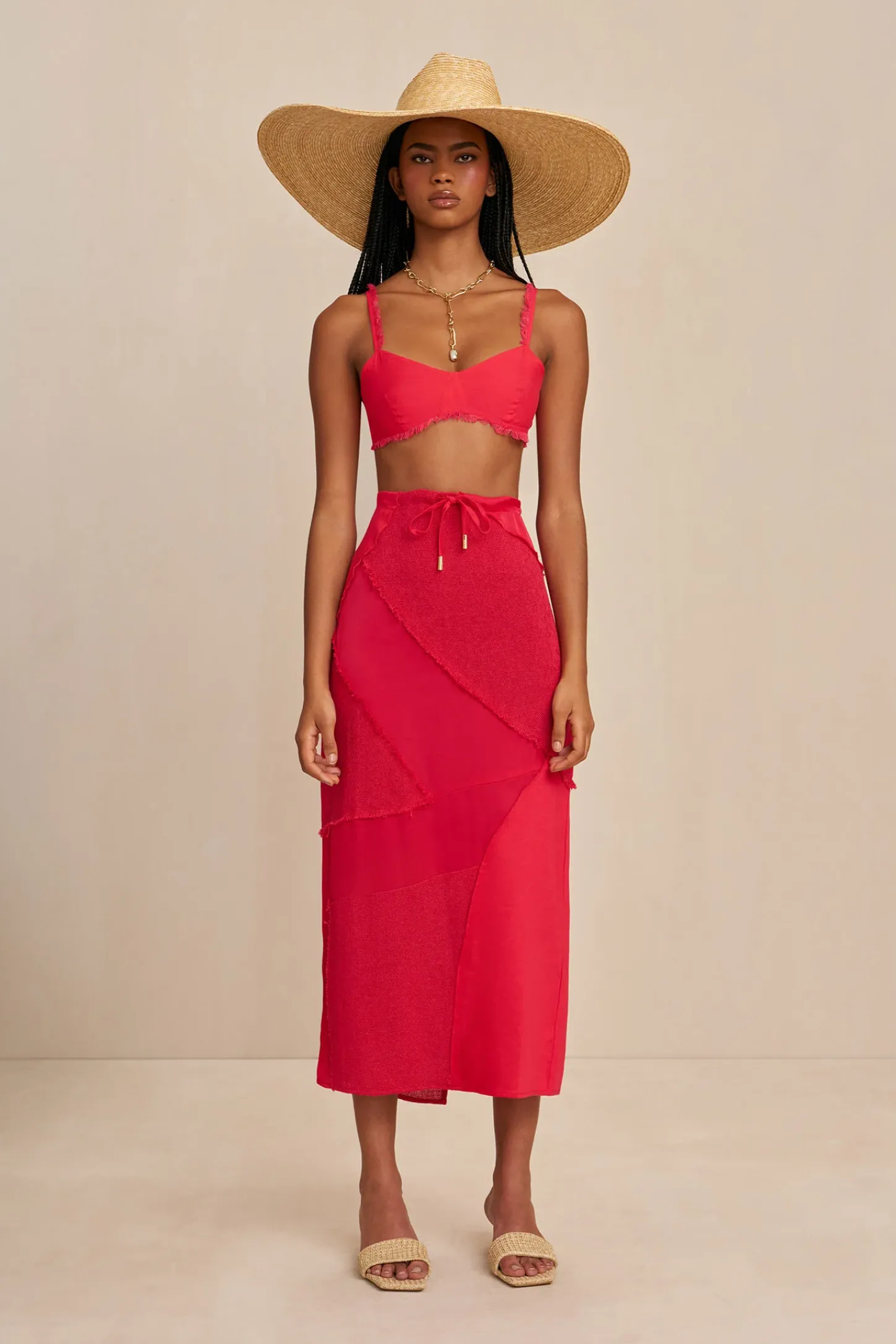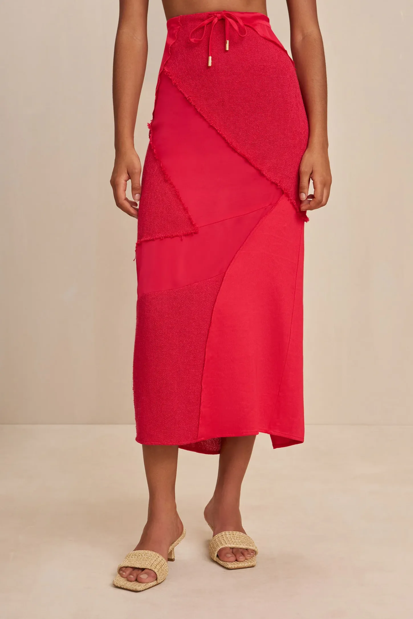 A patchwork, midi-length skirt with a drawstring waist.
