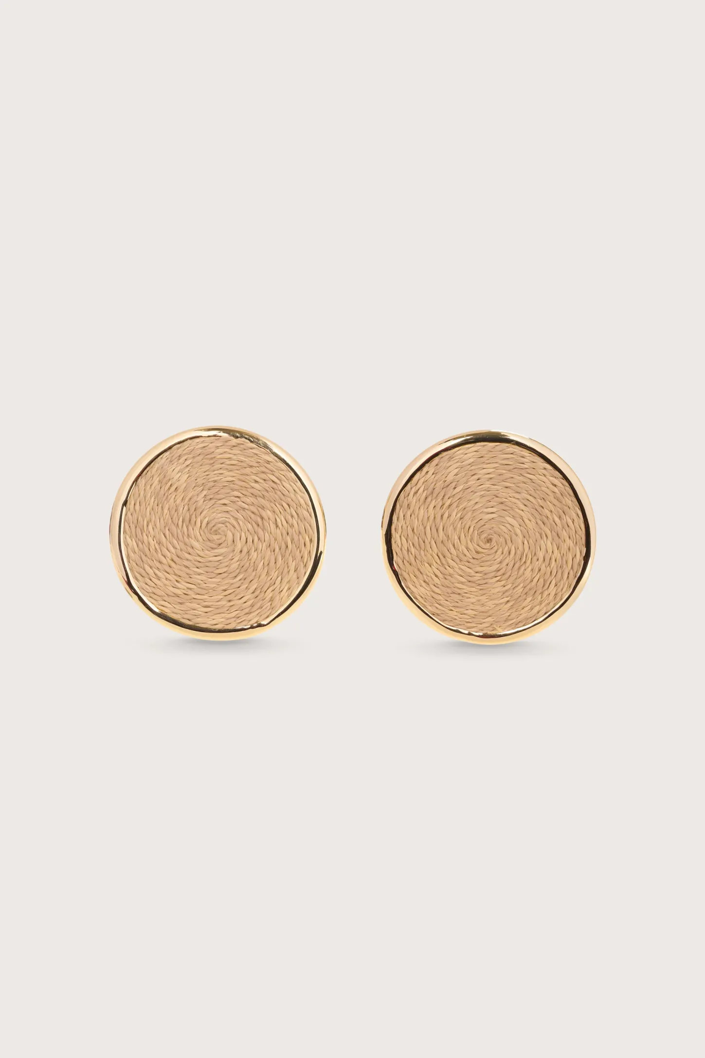 Oversized spherical clip-on earrings designed with natural rope encased in gold-toned brushed brass frames.