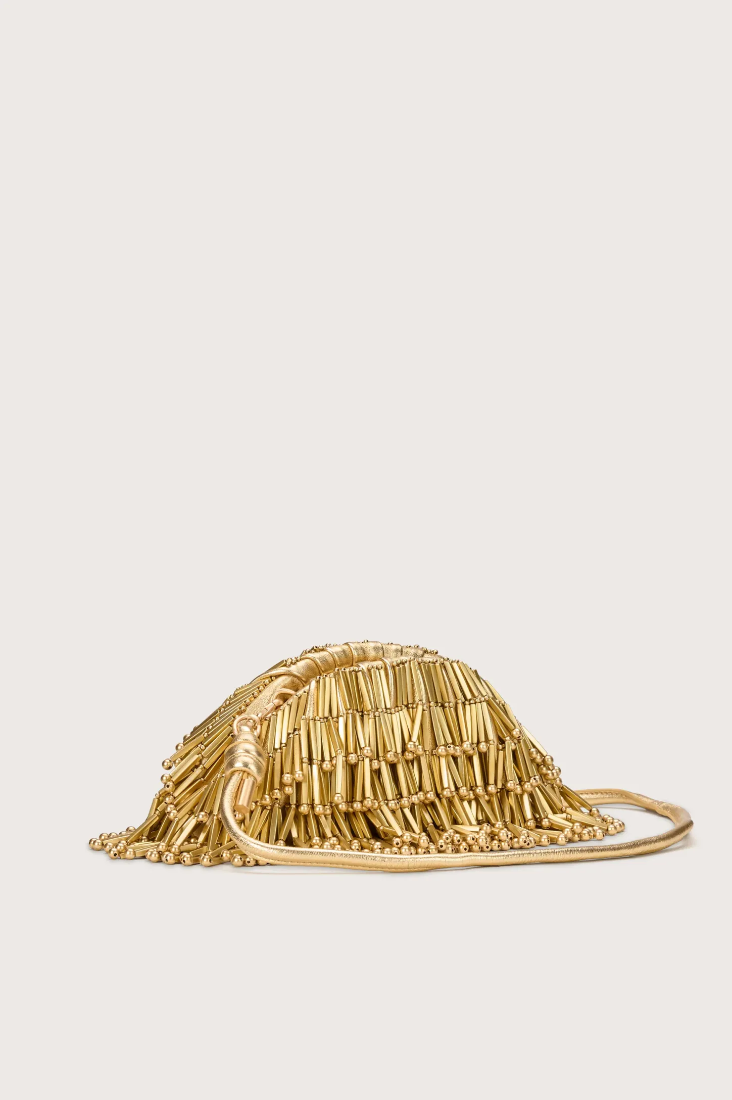 The soft shell-like shape of the Jaala Nano Bag has an undulating texture that adds dimension, while the golden tassels glimmer. Golden hardware tassels crowned in sculptural ball ends adorn the body of this textured bag. A detachable metallic leather strap adds even more sparkle to this shoulder bag. The cording of the shoulder strap ends in a knot and is capped at either end with gold-toned caps. The shiny shoulder strap hooks onto coordinating gold-toned chain links. With its lined interior, fits just the essentials.