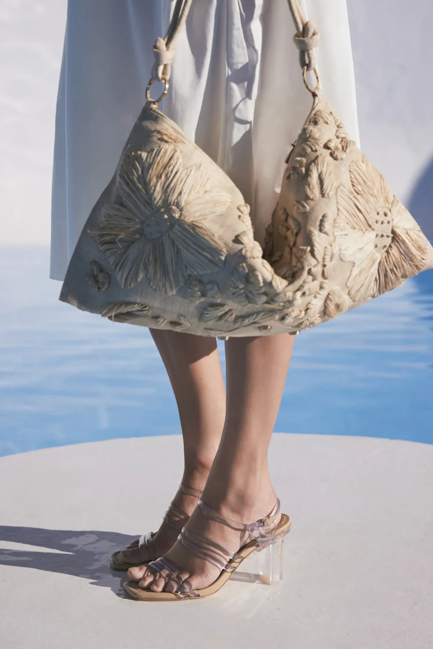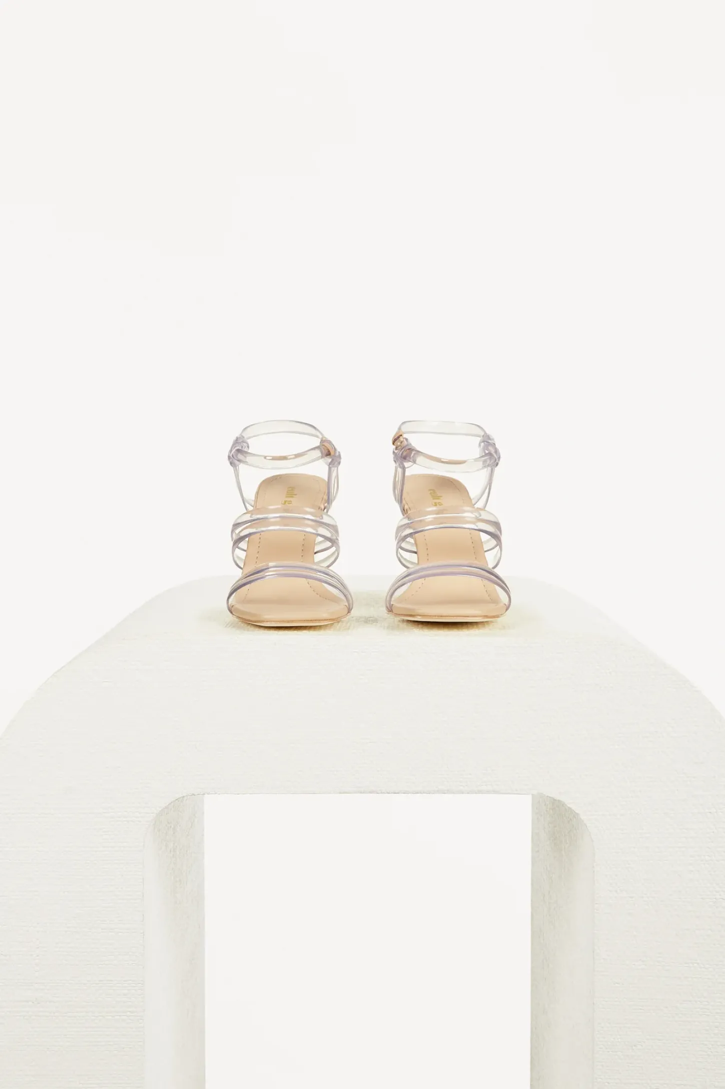 The passionate Kayla Sandal juxtaposes the angular lines of the robust heel and the square toe with the soft straps that are double banded across the toe and foot and tied artfully at the ankle. A clasp is hidden on the interior side of the ankle and the heel bottom is padded in leather to provide a subtlety to this bold look. Available in Clear and Off White.