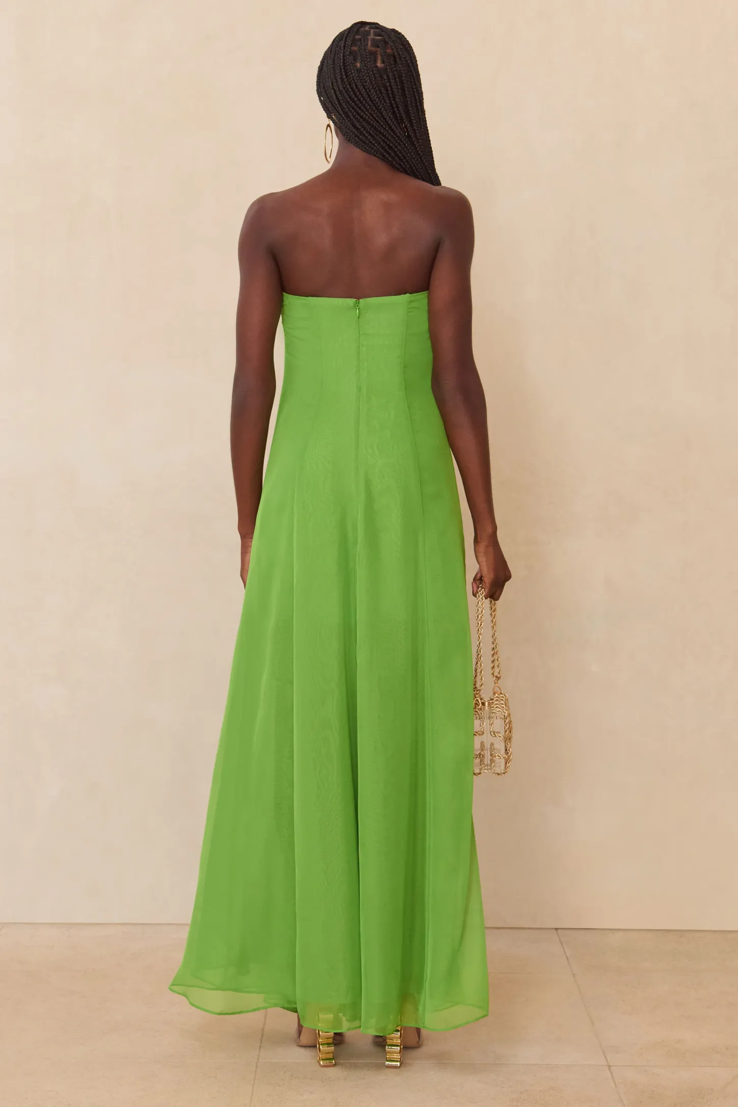 Janelle is an ultra-flowy gown in marshmallow chiffon featuring a fitted bodice with a sharp, triangular cutout at the central bust that compliments the spread of the ankle-length hem. A back zip allows for easy fit. Her semi-sheer Fern fabric adds even more movement to this gorgeous gown.