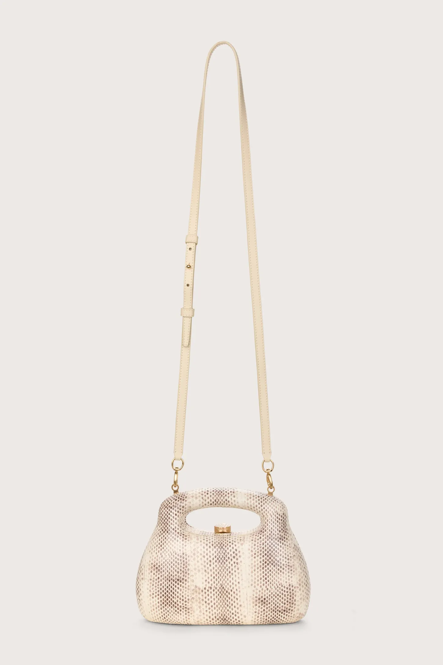 A stamped snakeskin leather mini handheld bag.