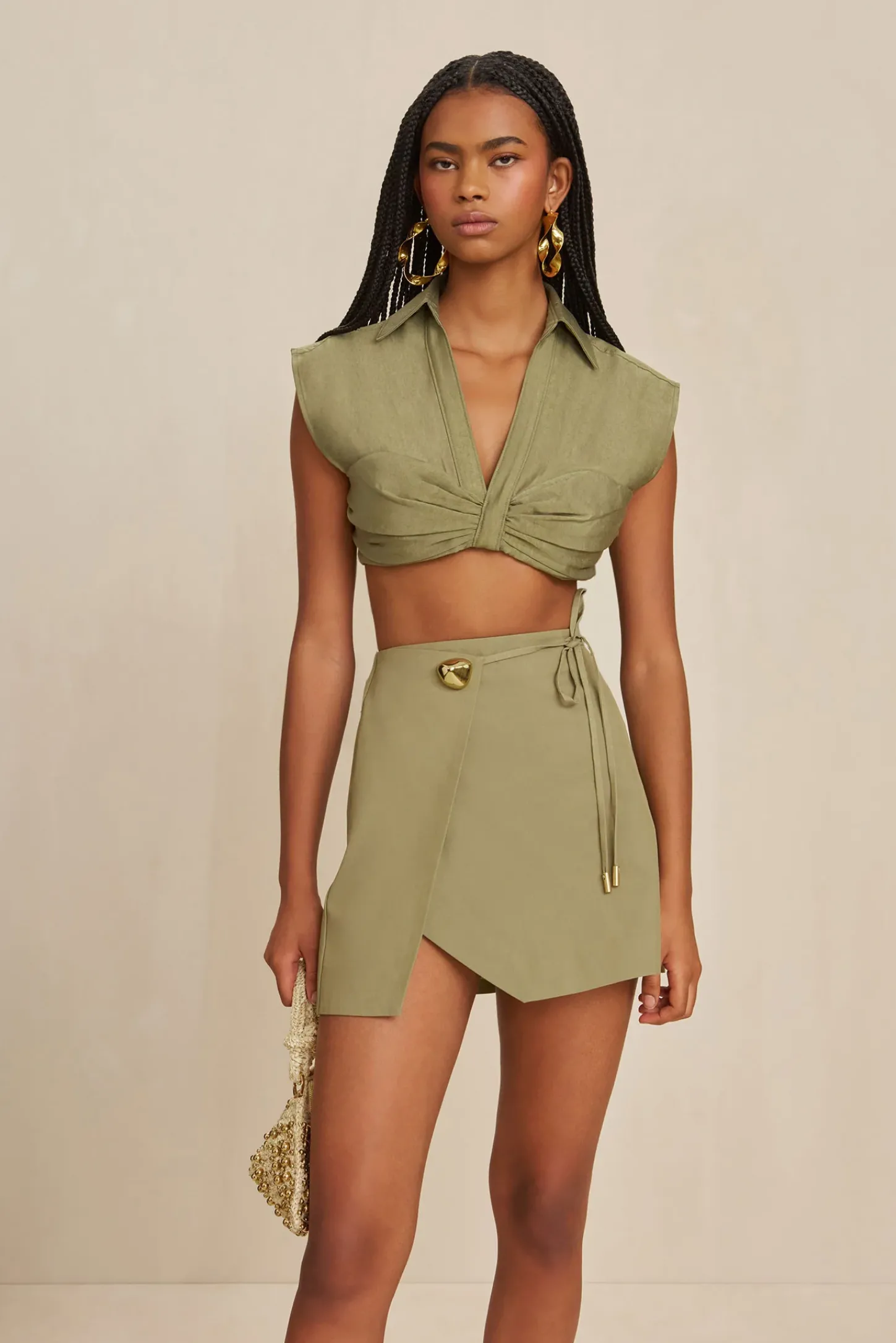 A collared crop top with a gathered bust, deep V-neck and back darts.