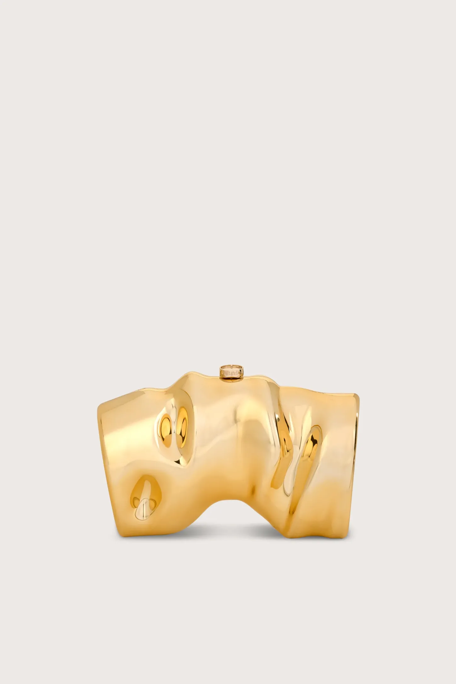 A molded scrunch shape forms the shiny gold metallic shell of this handheld clutch.