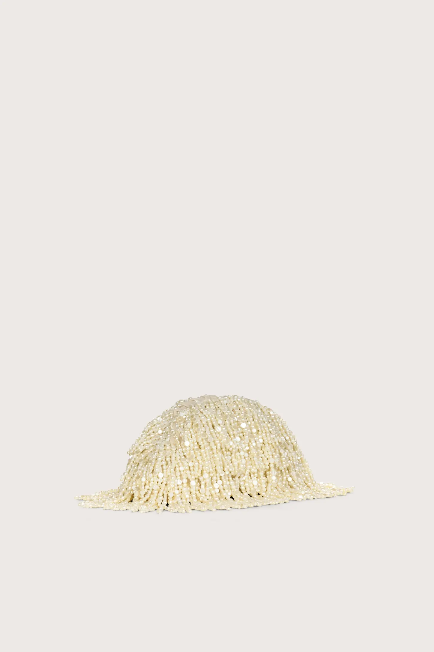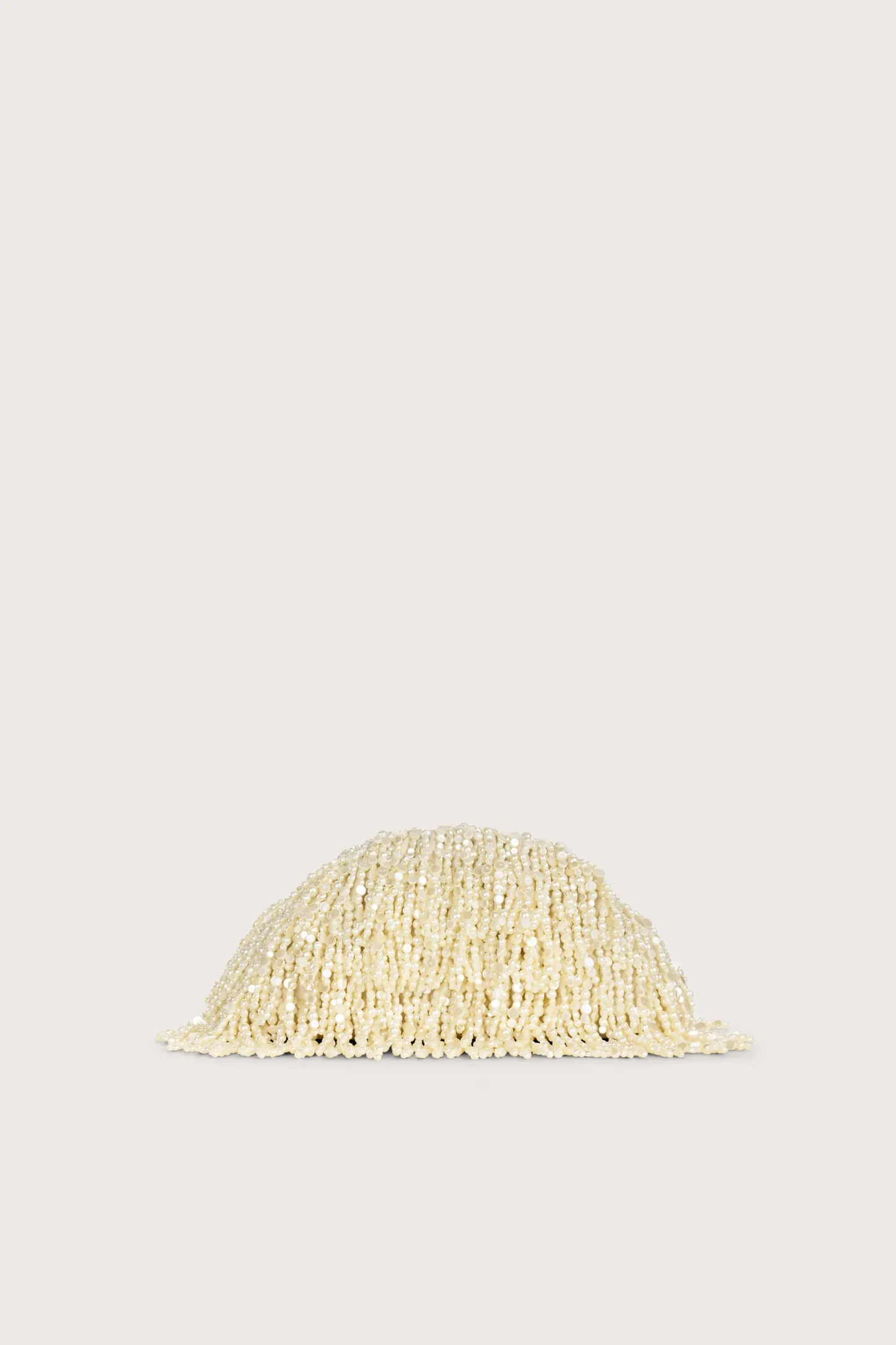 Pearl beaded tassel fringe cover a soft ivory leather shell of this clutch.