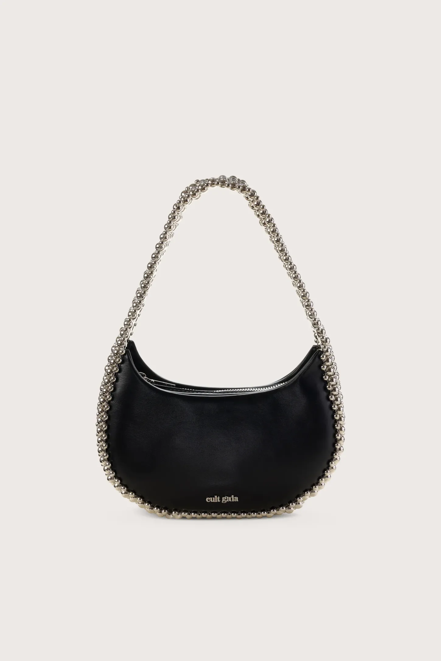 A shoulder bag with a horned body featuring silver-toned brushed-brass beading that trims the sides and becomes the straps.